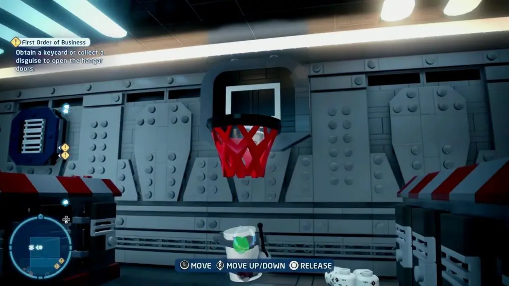Go to the location marked as ‘2’ on the map. Here you will find a basketball hoop as shown in the picture below. Use a Jedi to lift a block lying next to the hoop and drop it through the hoop. This will make the Minikit spawn below the Basketball Hoop.