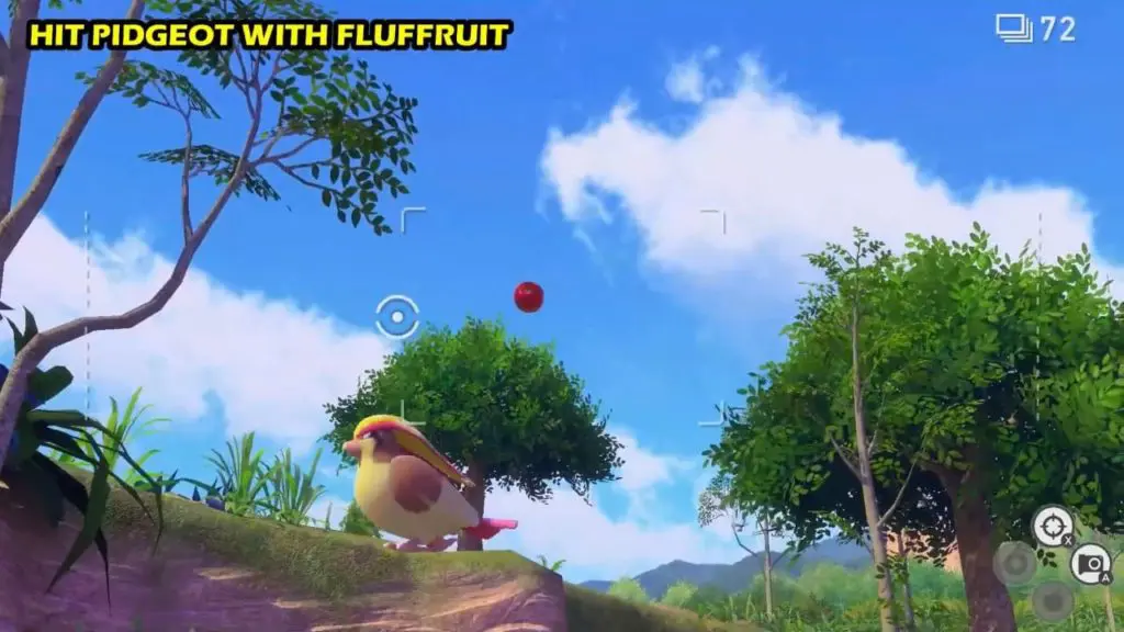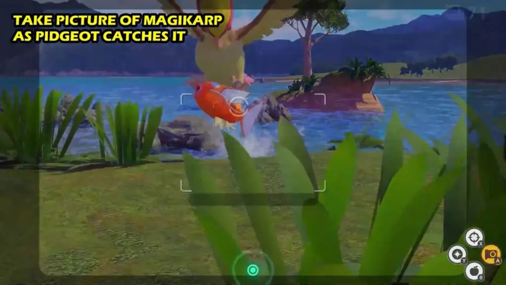 Now, when you reach near to the Magikarp flopping around on the right, throw fluffruits near it and the Pidgeot will grab it. Take a picture of Magikarp as Pidgeot grabs it.