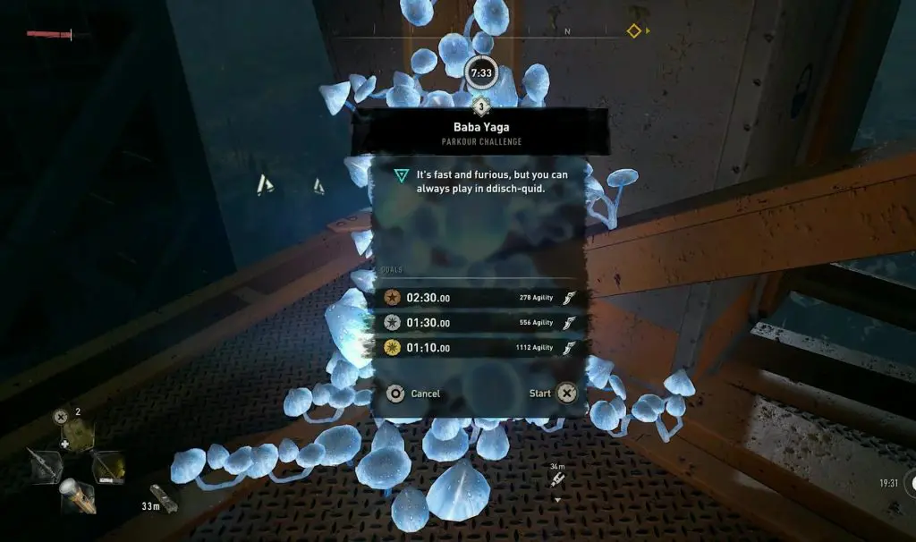 Keep interacting with the small mushroom formation until it fully grows. When the mushroom is fully grown, interact with it to start the Baba Yaga broomstick challenge.