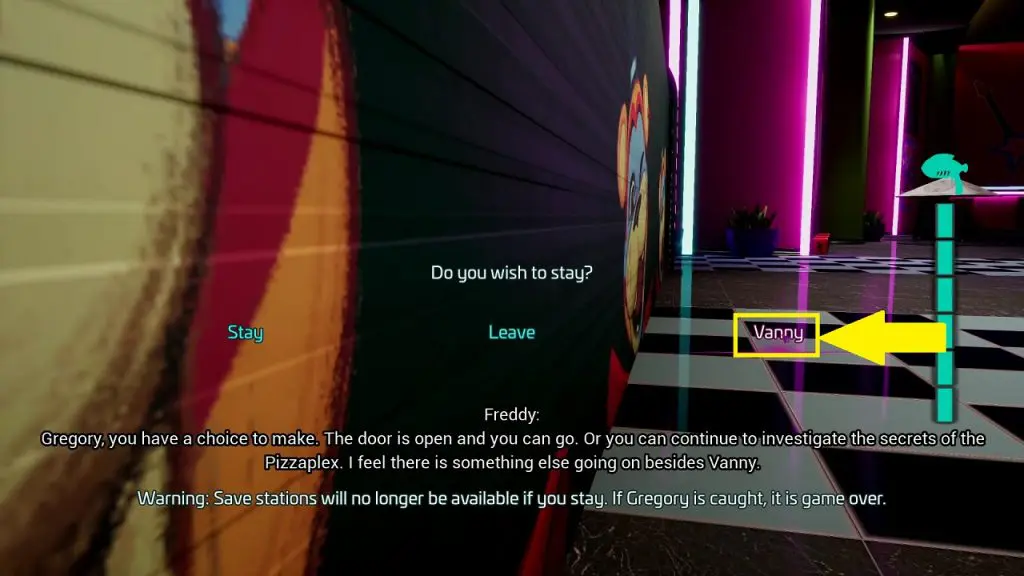Once you have played the 2 princess Quest Arcade games, go to the Pizzaplex front door. This time, you will also get the ‘Vanny’ option other than ‘Stay’ & ‘Leave’, as shown in the picture below. Choose the ‘Vanny’ option.