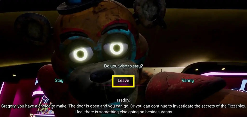Now proceed through the game and go to the Pizzaplex front door at 6 AM. This time, you will also get the ‘Vanny’ option other than ‘Stay’ & ‘Leave’, as shown in the picture below. Choose the ‘Vanny’ option.