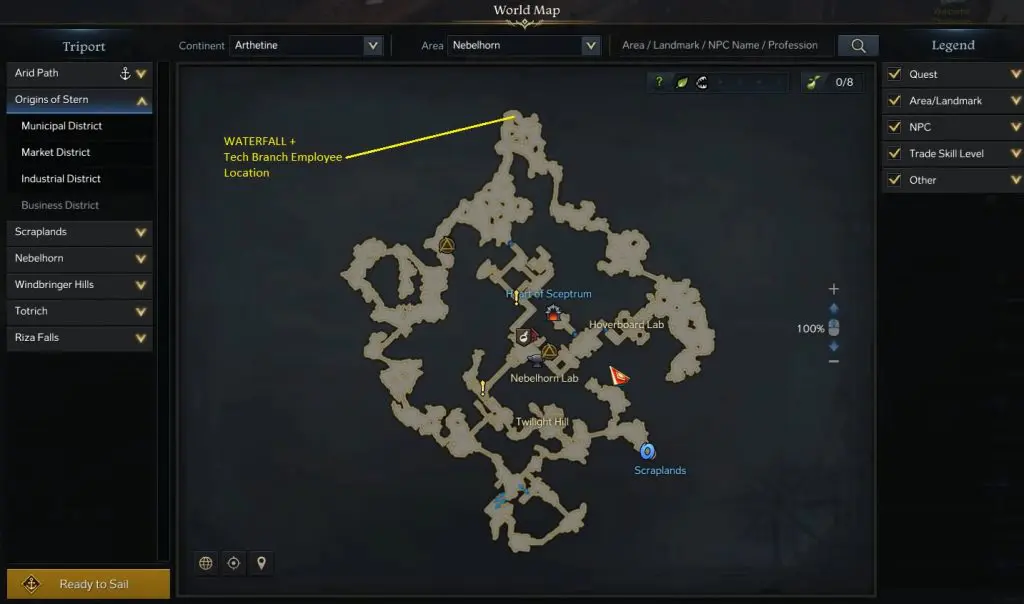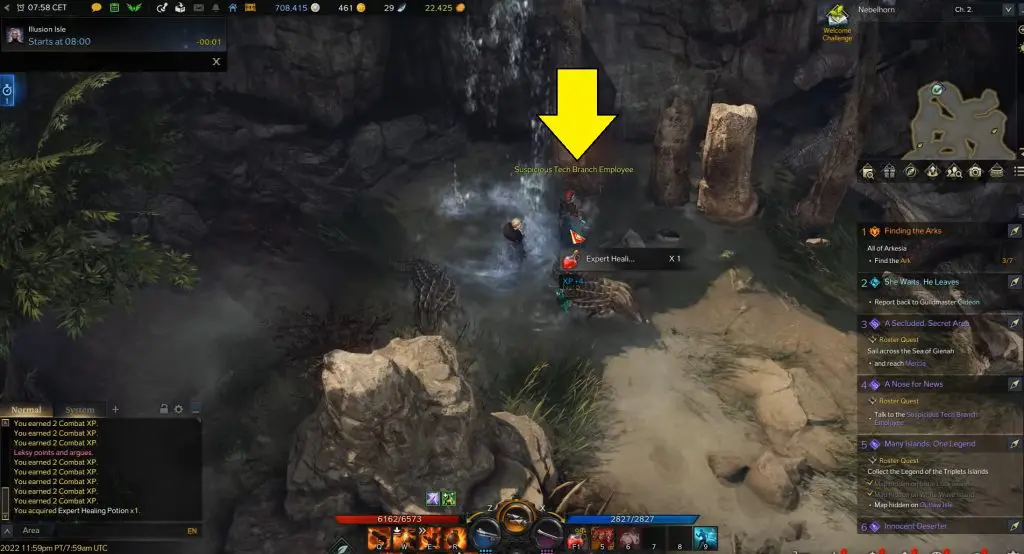 In this quest, Lab Director Yulia will tell you that the water temperature in the Nebelhorn Oasis in Nebelhorn area of Arthetine region is abnormal last month, and she will ask you to take new measurements to be sure.
