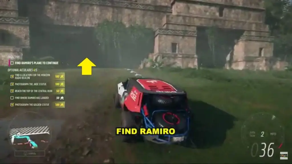Find where Ramiro has landed: To find where Ramiro has landed, go to the very southern side of the area as indicated on the map. Drive into the ruined building. Here you’ll find the plane and game allow you to leave the area.