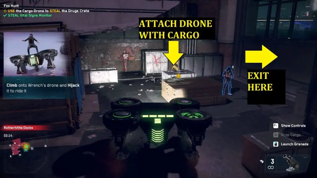 Here you are planning to steal the whole drug crate. Summon the Sergei drone and fly it over the medical crate to attach it. Climb onto Wrench’s drone and hijack it to ride it. Now open the big gate on the northern side of the building and escape the hostile area with the cargo. Deliver the medical cargo at the marked location.