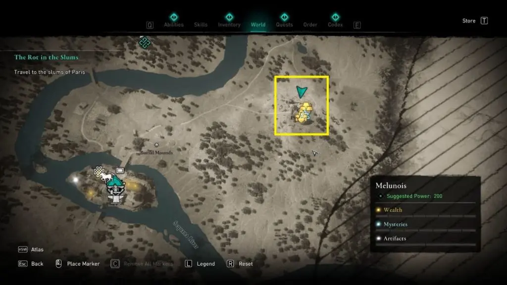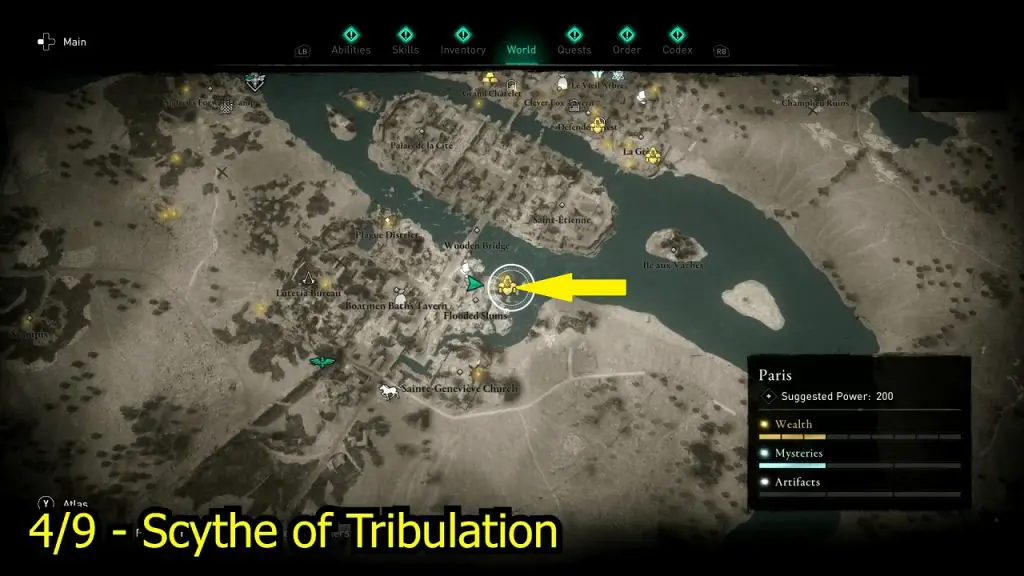 Scythe of Tribulation is inside a wealth chest in the Flooded Slums in Paris. At the location highlighted with a yellow arrow in the picture below, you will find a tomb in a flooded cemetery. Enter the tomb and swim down, then turn right. At the end of the path, turn right and swim up the stairs to get out of the water. Move ahead in a linear path and you will finally reach the room with the chest. Slide down the gap on the wall to reach the wealth chest containing Scythe of Tribulation.
