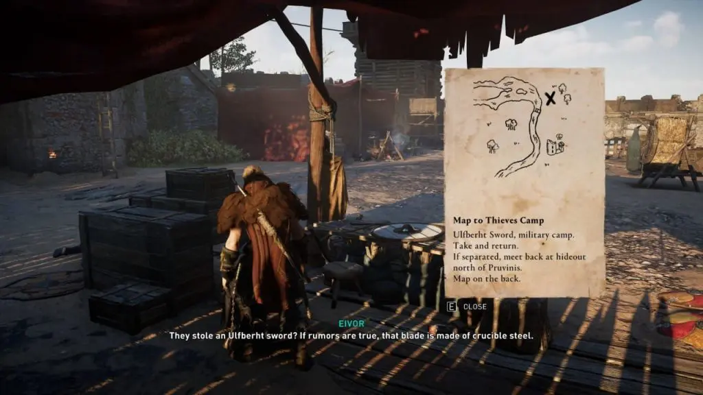 To get the sword you will need to complete a mystery event called ‘Ulfberht sword’. Go to Pruvinis (ruined fort) which is in the eastern part of the Melunois region (See pictures below) and take the ‘Map to thieves camp’ from the table to start the mystery event. The map points to the Ulfberht sword. You need to obtain the Ulfberht Sword to complete this mystery event.