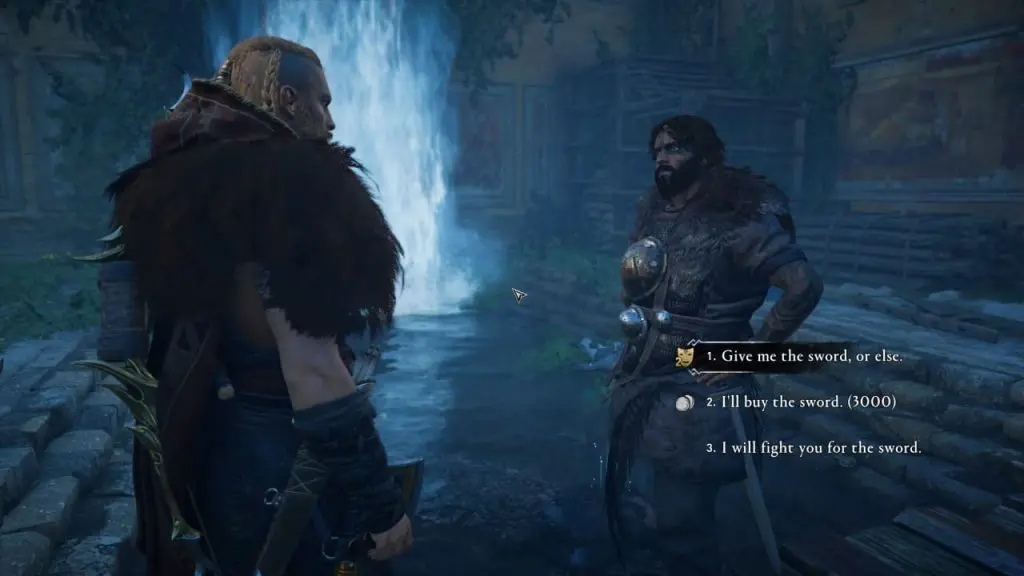 Ulfberht Sword can be found in Blihaut which is on the northeast corner of the Melunois region (check out the images below). The Norse man (thief) standing in front of the small waterfall has the Ulfberht Sword. Talk to him to get the sword and complete the mystery event (You will get Egbert Short Sword on completing the mystery). You’ll have three choices to get the sword: