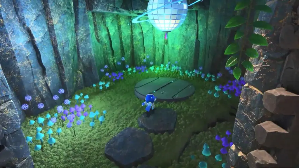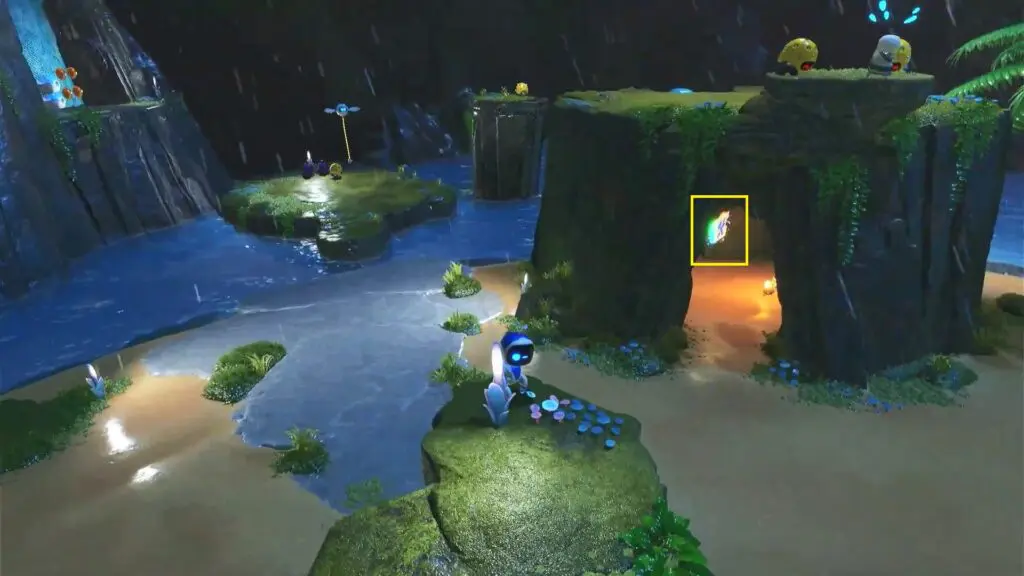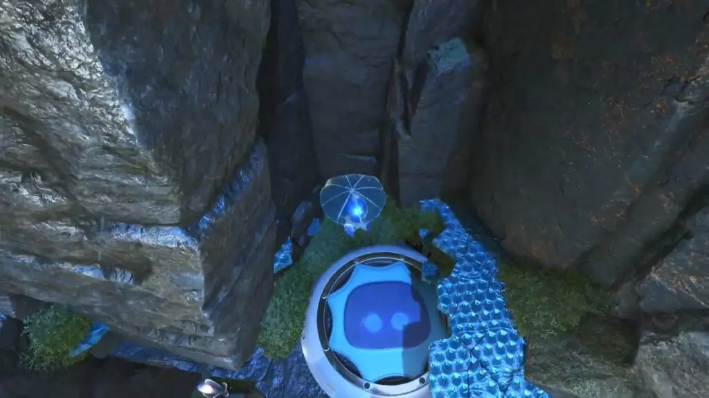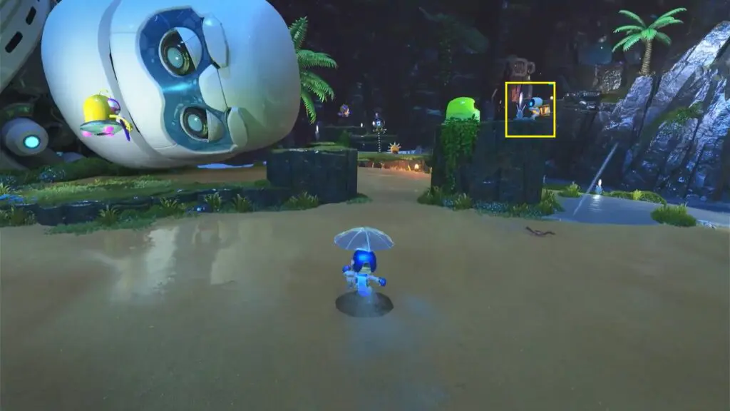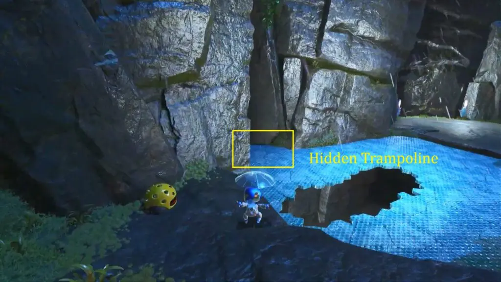 Use this trampoline to jump up and reach the ledge, where you’ll find the Bot.