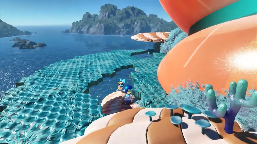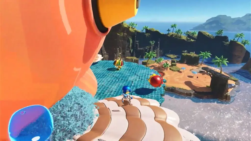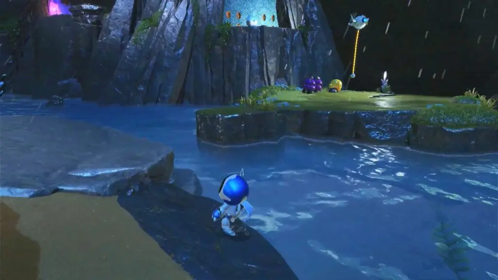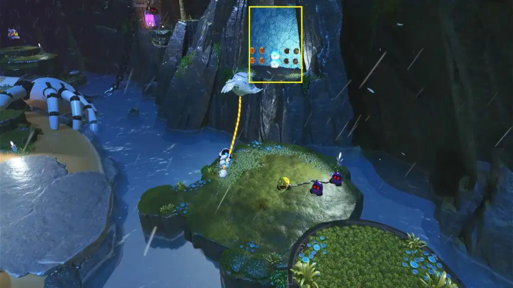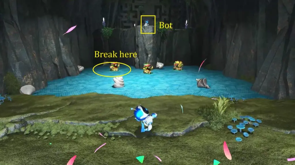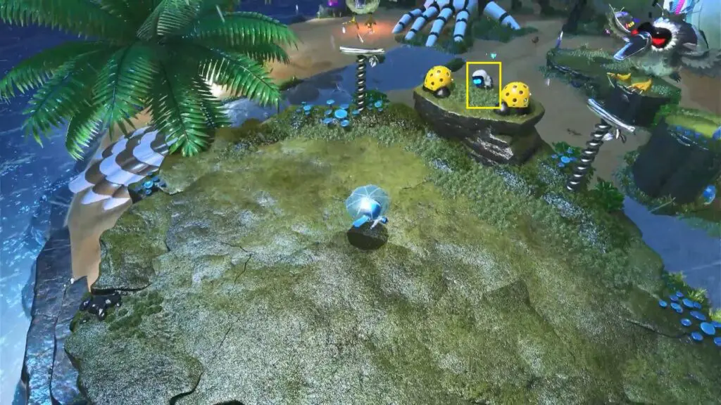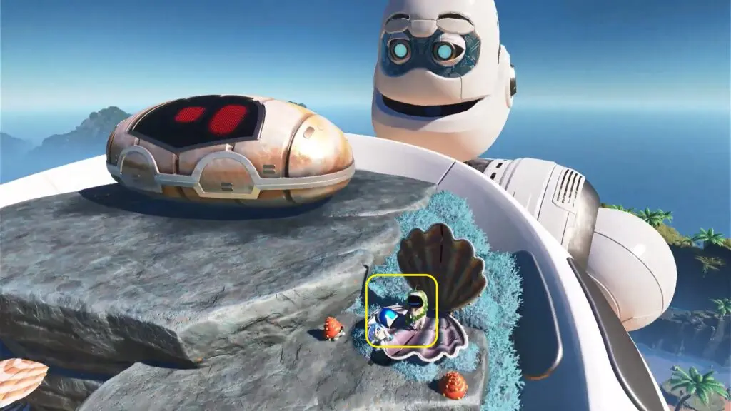 Approach Big Brother, and he’ll pull a shell tower from the sea. Jump onto his arm and climb up to his hand, then head to the back of his neck to find a Bot.