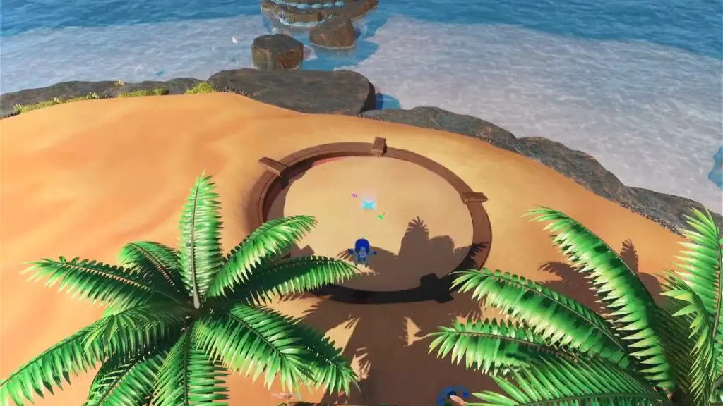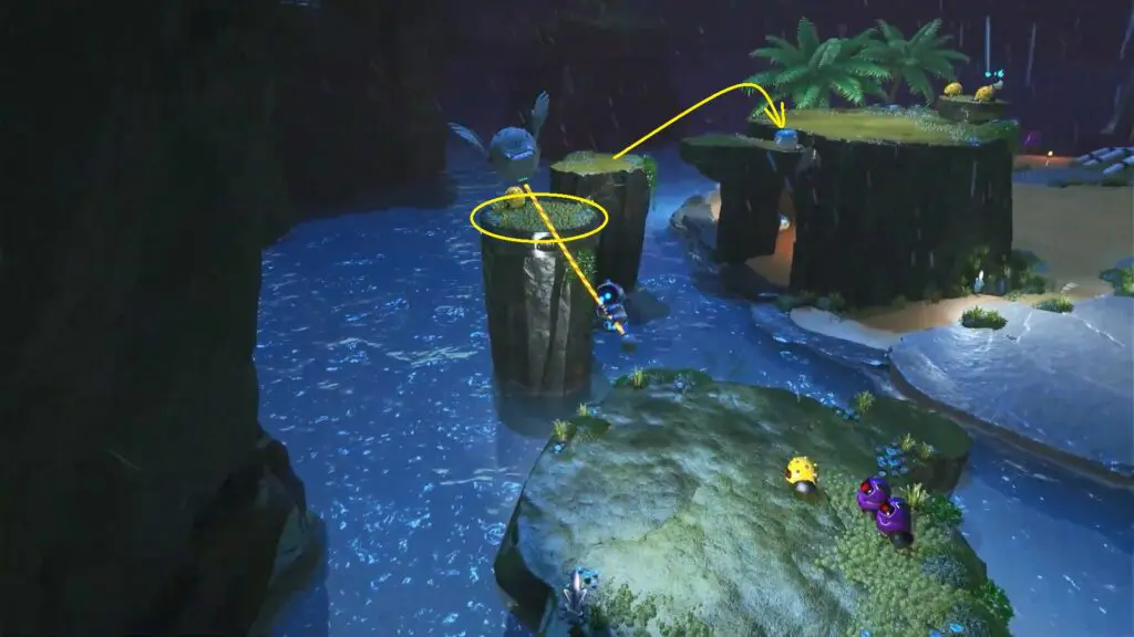Head left to return to the starting area. Swim across the water to reach the three rocks in front of the island, as shown in the image below.