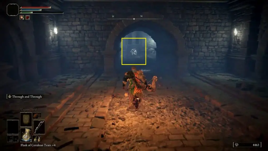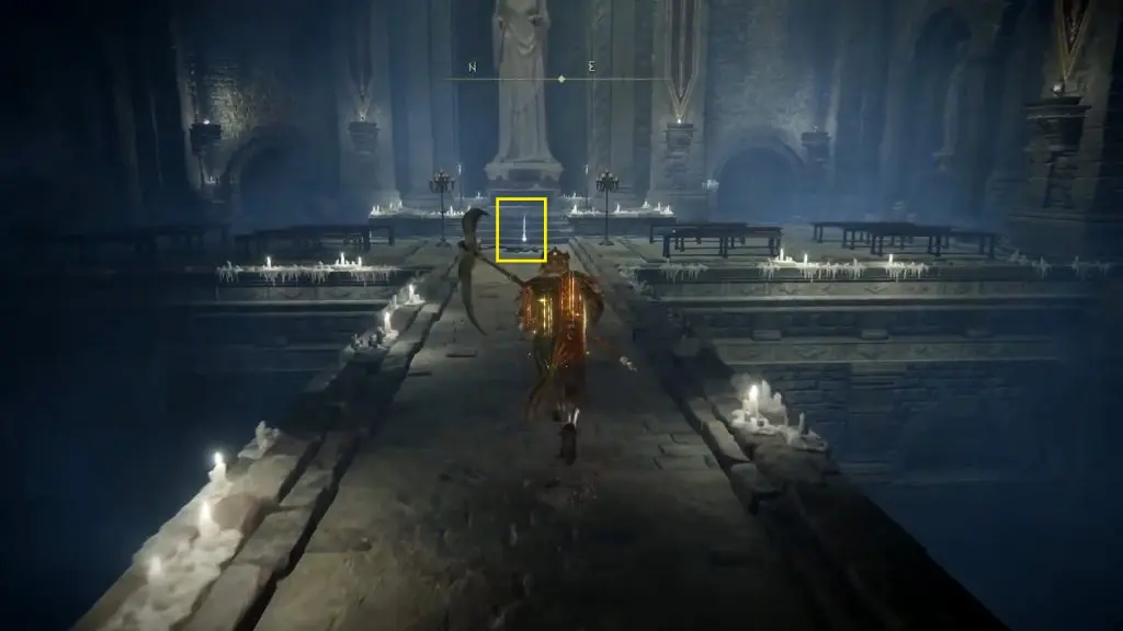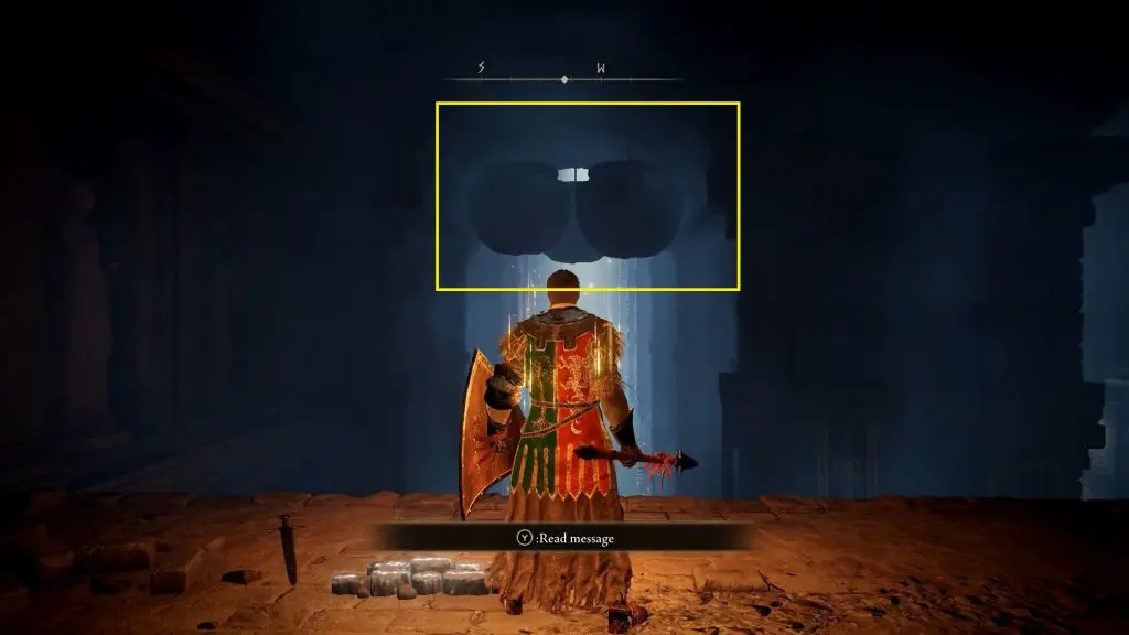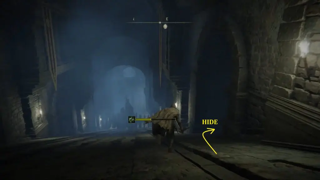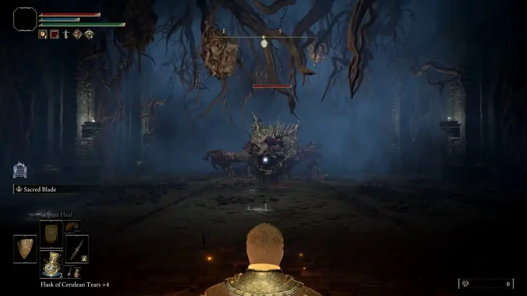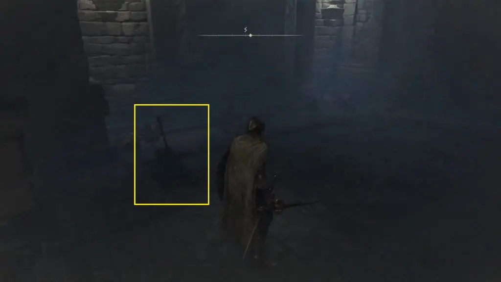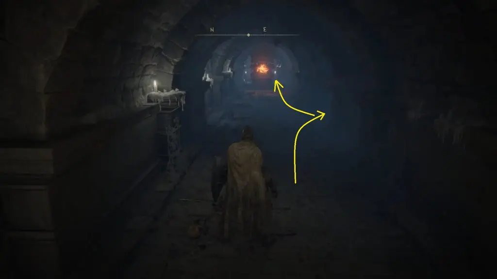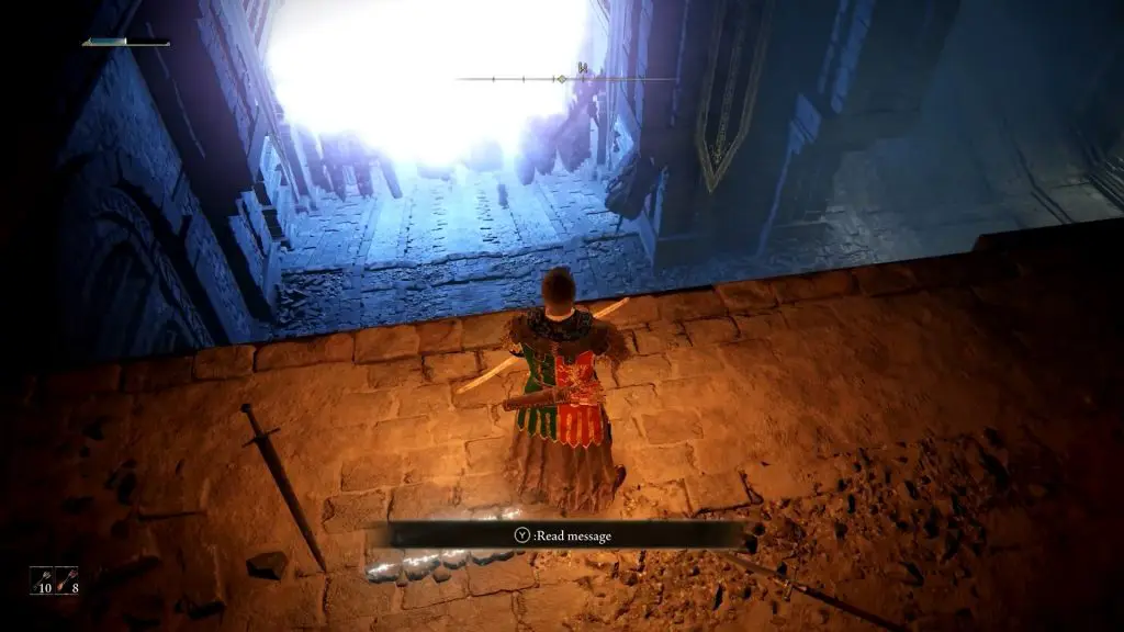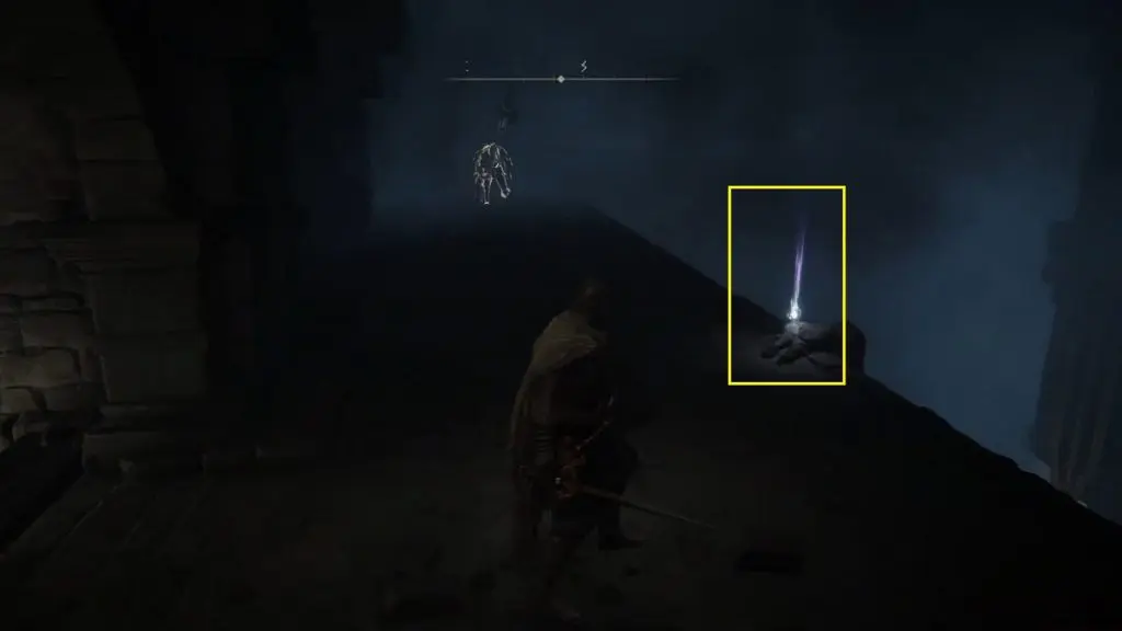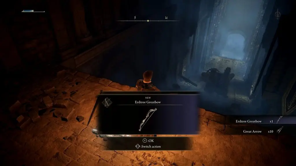 After collecting the key, go to its left. Here you will see three pots hanging from the ceiling as shown in the picture below. The mechanical chariot rolls below these pots. You will have to shoot the rope holding the pots so that the pots drop on the chariot and destroy it. Since there are 3 pots, you will have 3 chances to destroy the chariot. If you fail, then you will have to rest to make the pots appear again. If you succeed in destroying the chariot, it will remain destroyed for the entire game. Since the chariot moves fast, this is quite difficult. A good trick is to hear for the distinct clunking sound when the chariot hits the bottom of the slope, which is just before the point where the pots are hanging. Shoot the rope as soon as you hear the clunking sound. If you succeed in destroying the chariot, you will receive Erdtree Greatbow.