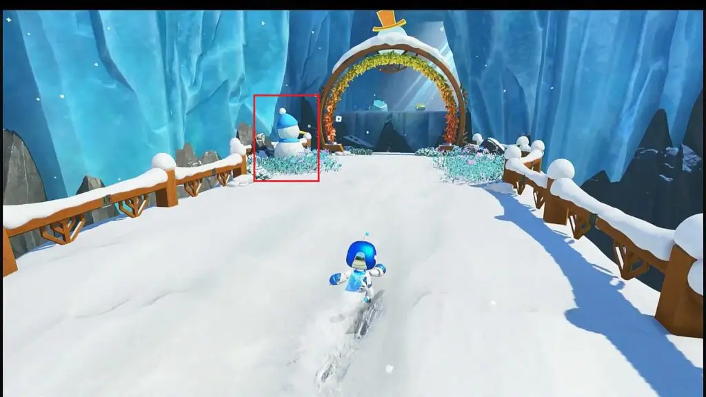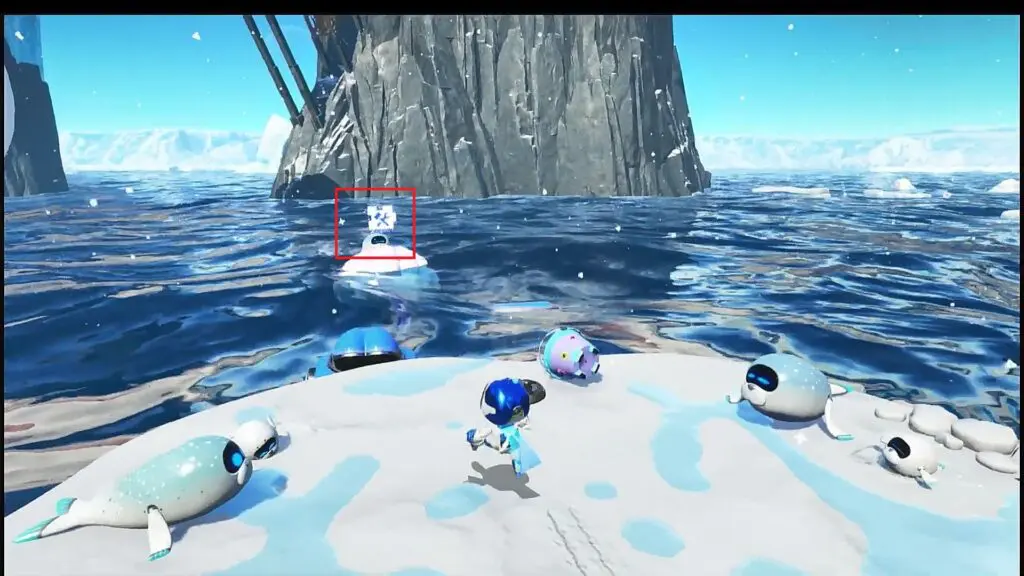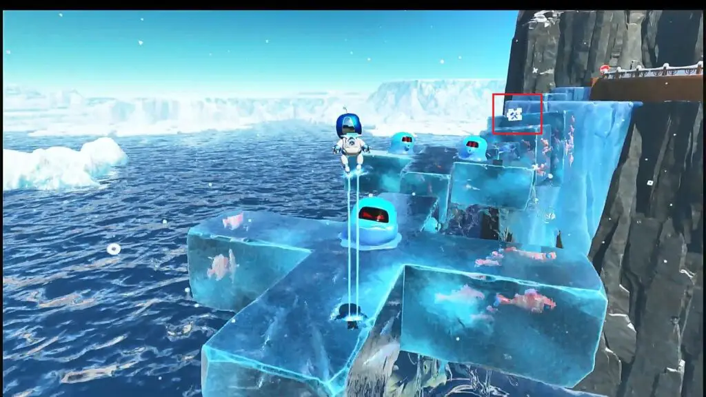 In this level, you will come across a frozen lake. As you proceed ahead from the frozen lake, after collecting Bot #6, you will have to jump across some rotating ice platforms as shown in the picture below. The final puzzle piece is on one of these rotating platform as shown below.