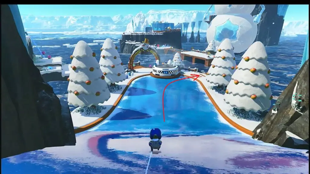 As you progress in the level, you will reach a fake finish line as shown in the picture below. Go right before the platform and destroy the snowman there. This will reveal some wires sticking out from the ground. Pull the wires to make the puzzle piece appear ahead in the water as shown in the second picture below. Jump on the crocodiles to reach the puzzle piece.