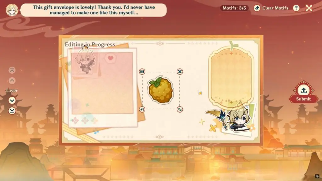 Players must create a custom envelope with 5 Motifs only by choosing any yellow and orange motif. Players can choose different backgrounds or some fruits in yellow and orange colors.