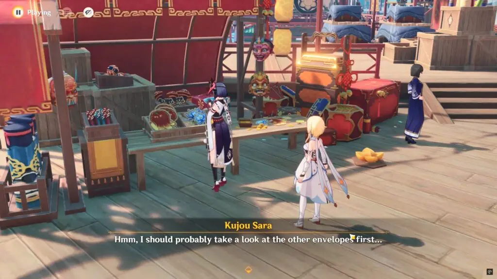 The Custom Gift Envelope No. 2 can be obtained from the NPC Kujou Sara. She will request that you create an envelope with a flower-themed design. Add three or more flowers of different kinds to the envelope.