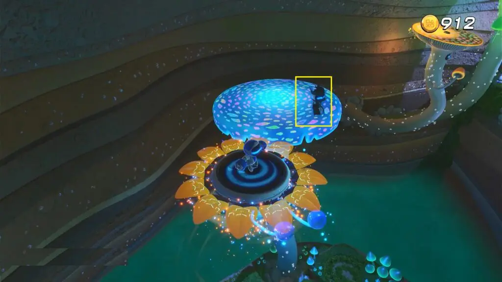 Next, head to the platform with three mushrooms and pull the nearby wire to get a flower. Use it to fly to the top of the platform.