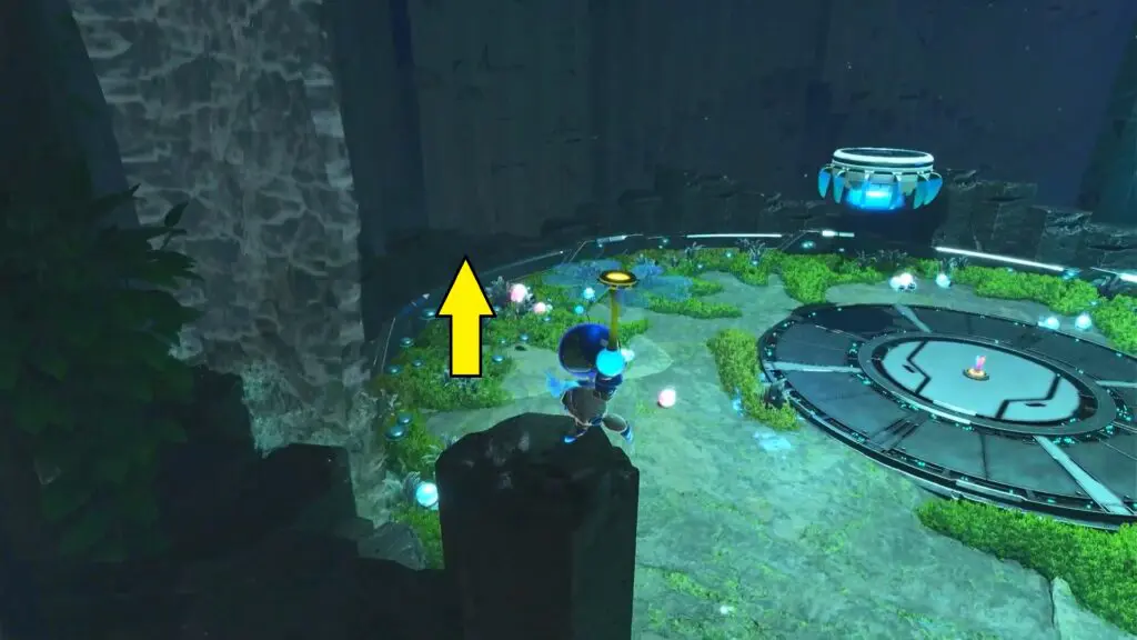 Exit the previous tilting platform area to return to the cave, then go up the waterfall. Defeat the large enemy and pull the wire underneath it to get a spinning flower.