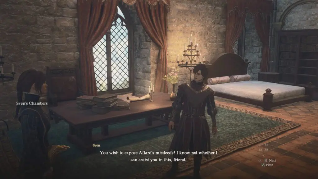 Go to Venworth Castle and speak with Sven in his rooms inside the Guardhouse until he mentions Allard. He will request that you meet with Patrick in order to learn more about Allard’s misdeeds.