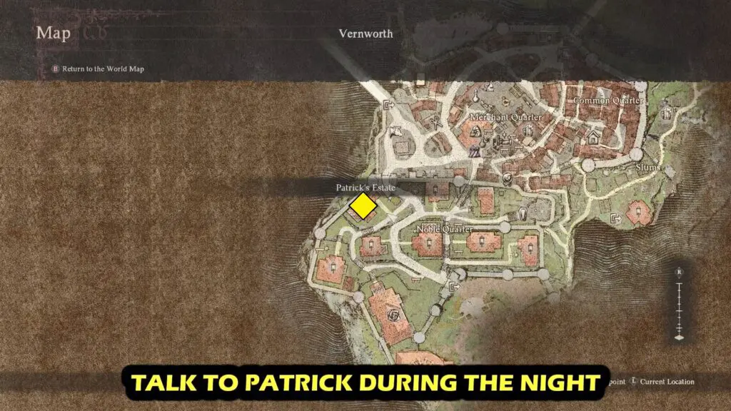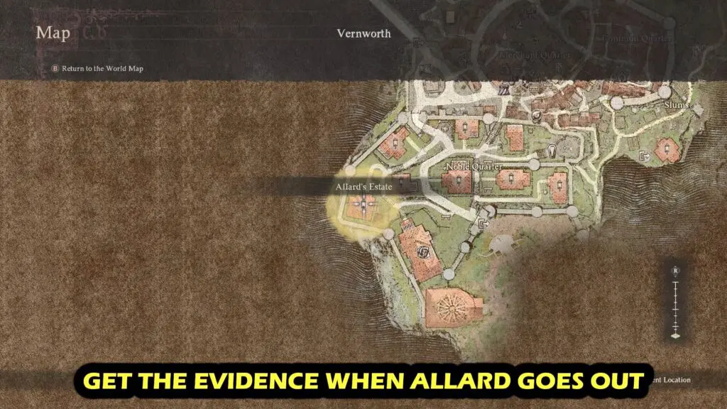 At night, visit Patrick’s Estate, which is located on Vernworth’s southwestern side. Speak with Patrick, and he will agree to lure out Allard for you.