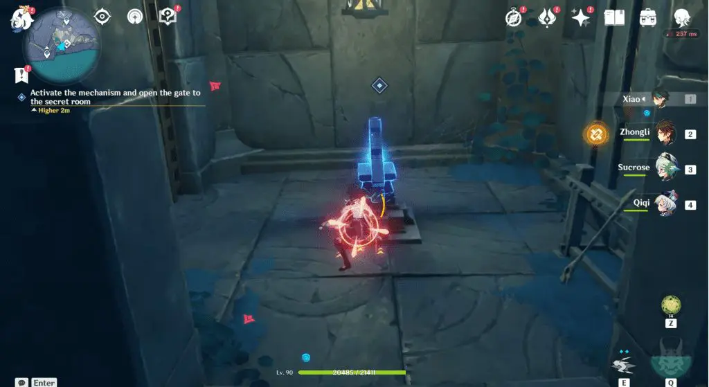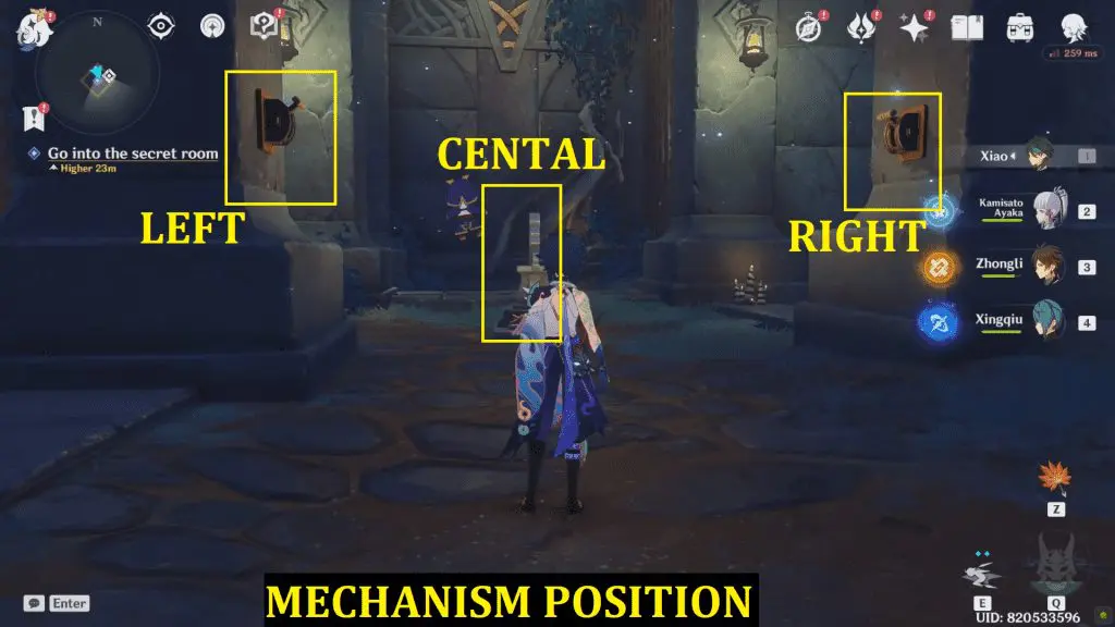 Inside the secret room, you will find a mechanism puzzle. There are two mechanical levers attached to two different pillars and one in the middle that can be activated with the normal strike. You will also find an ‘of sun and moon‘ mechanism in the secret room at one corner. Refer to the below image. Interact with them in mechanism in this order: