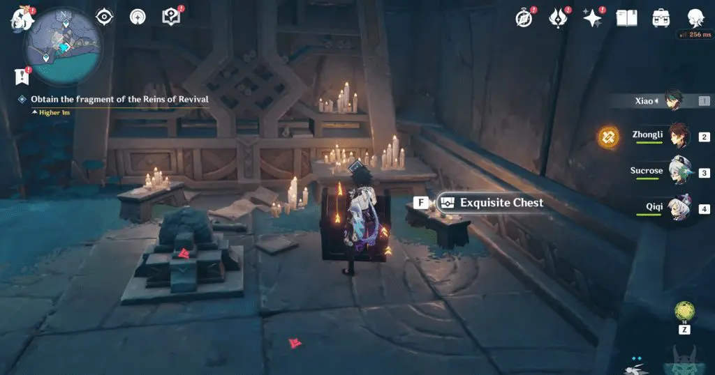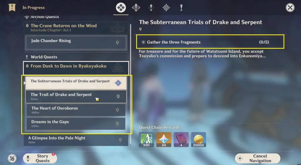 This guide shows how to complete the objective “Gather the three fragments” of the world quest “The Subterranean Trials of Drake and Serpent“ in the Enkanomiya area in Genshin impact 2.4. Aru will ask you to retrieve three fragments of Reins of Revival, which would then be stitched together with the Golden Bridle. To collect three fragments you need to complete three more subquests as shown below. You can obtain one fragment after completing each subquest.