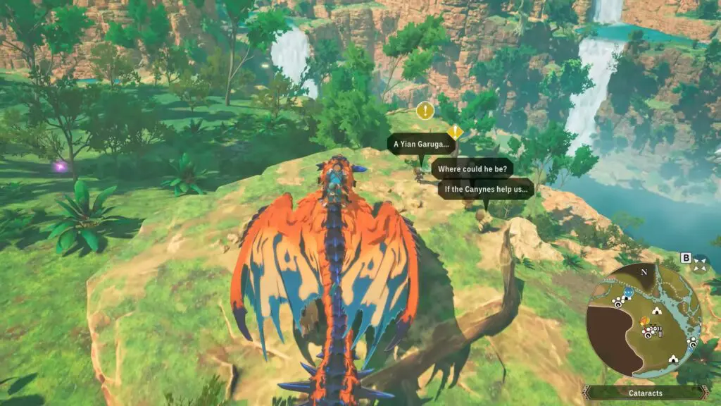 To find the missing villager, fast-travel to the Mt. Cataract lookout point. Here, you will meet a group of search party NPCs. Speak with the search party NPCs. They will tell you that the missing villager went off to hunt a Yian Garuga in the skies above Canalta Timberland and point you toward the highest point on the top of the mountain.