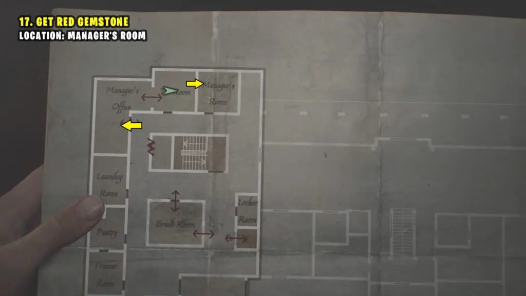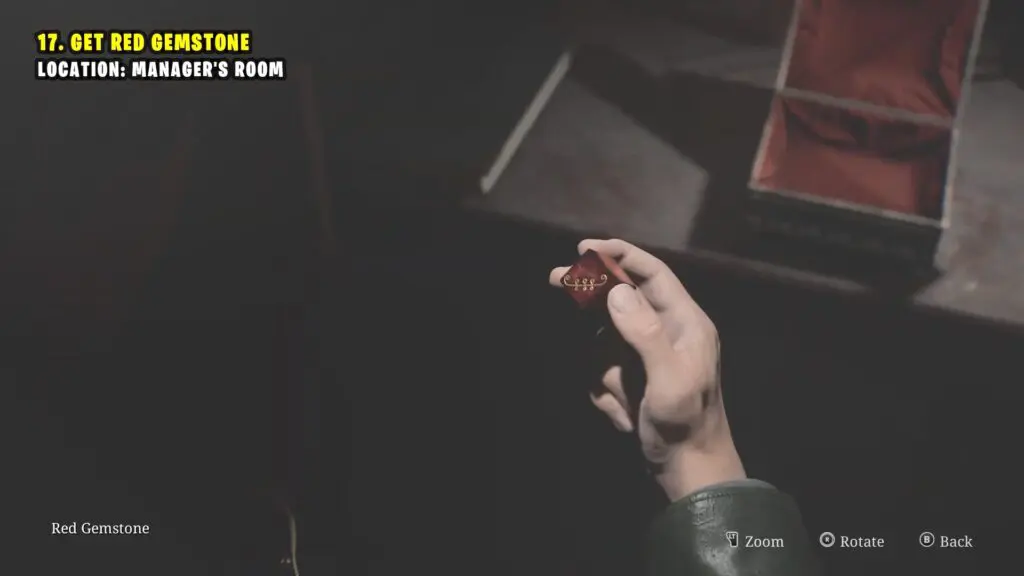 Go to the Manager’s Office, then head to the TV Room. Move the wardrobe to access the Manager’s Room and collect the Red Gemstone.