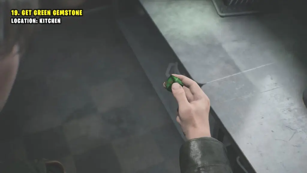 Leave the freezer room through the hole in the wall, then head to the kitchen. Pick up the Green Gemstone from the table.