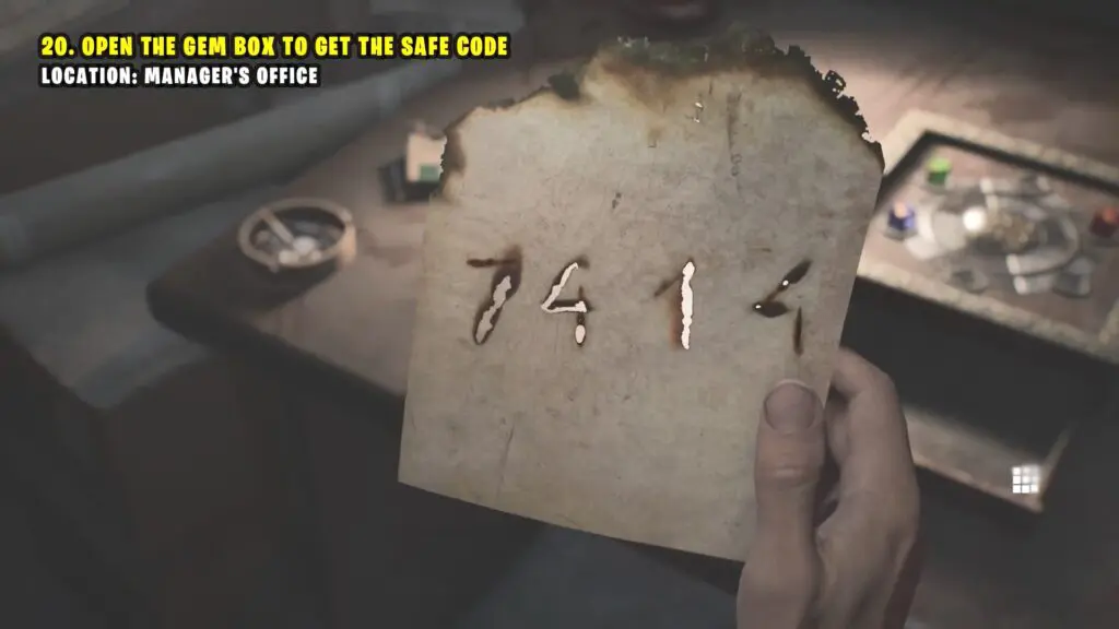 Go to the Manager’s Office and put the three gemstones in the box on the desk. This will unlock a drawer in the box with a burned piece of paper inside.