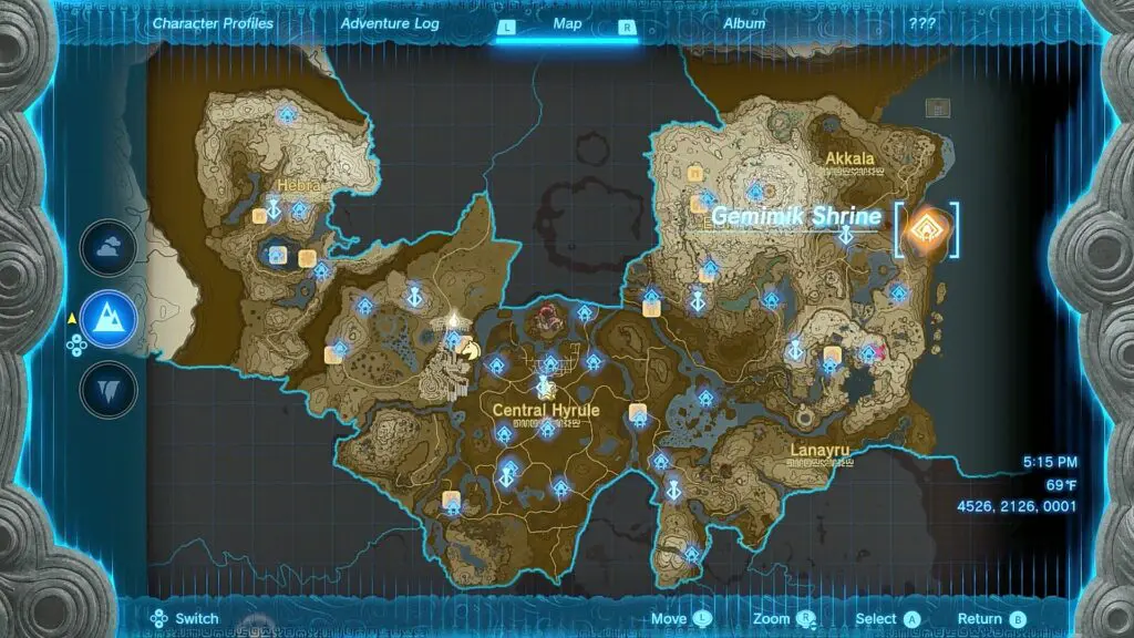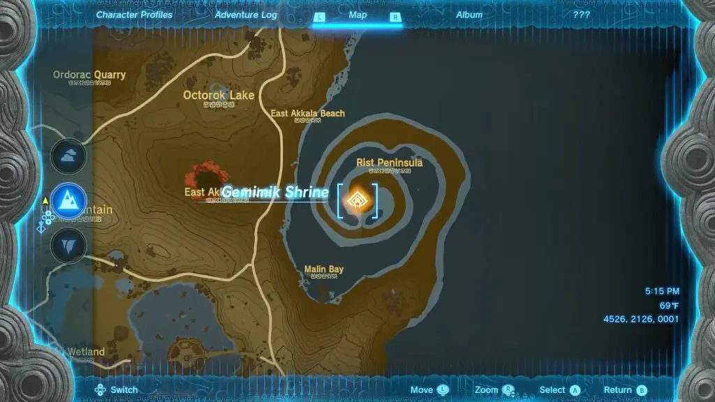 This guide shows the complete walkthrough of the Gemimik Shrine in the Legend of Zelda: Tears of the Kingdom game, released on 12th May 2023. The Gemimik Shrine is at the location shown in the pictures below.