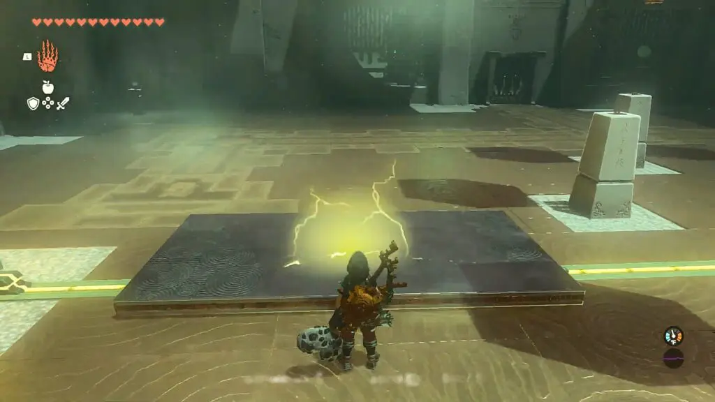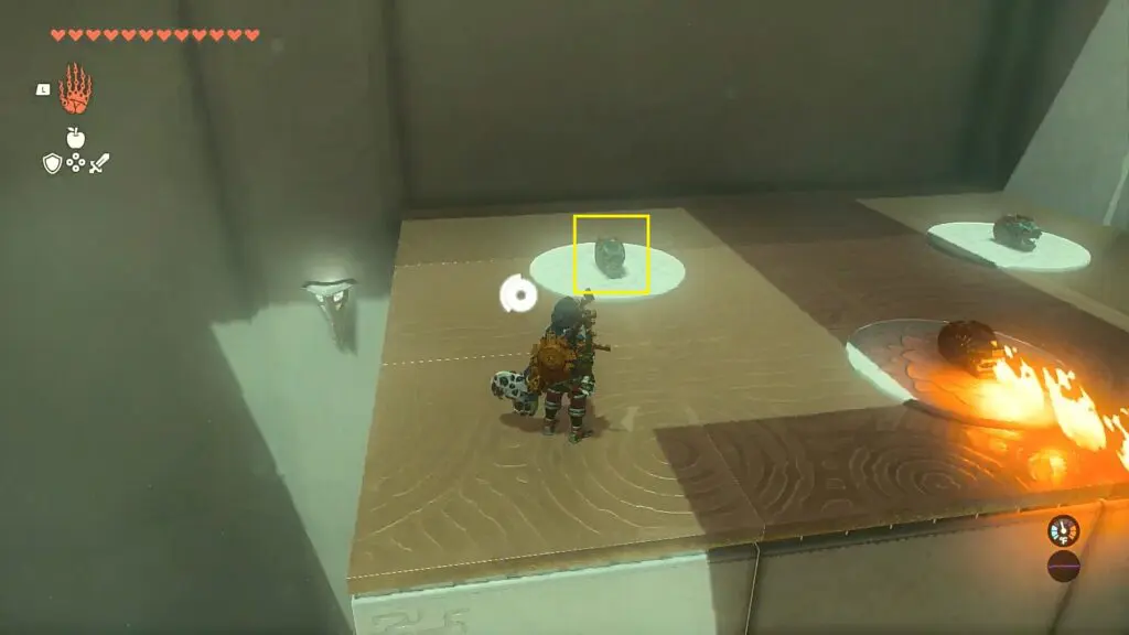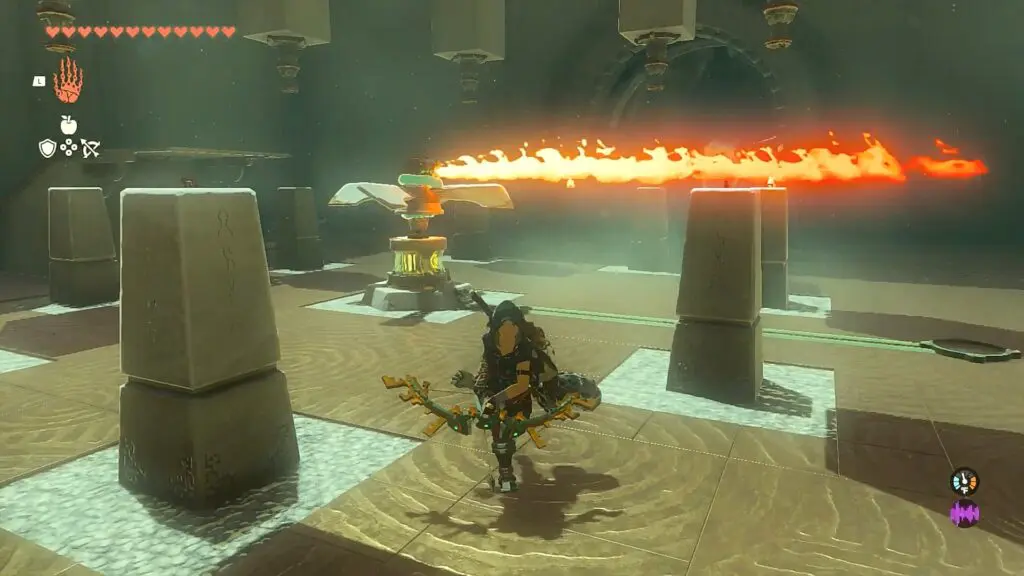 Go back down. Remove the metal slab from the circuit, stopping the fan. Then pick up the dragon head and attach it to the top of the fan as shown in the picture below. Then hit the Dragon’s head for it to start throwing fire as shown in the second picture below. Now use the metal slab to complete the circuit, restarting the fan. As the fan rotates, the dragon head will rotate with it, lighting up all the torches around the fan. This will open the iron gate. Go through it to get the Blessing and complete the shrine.