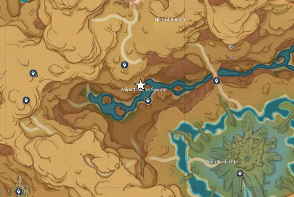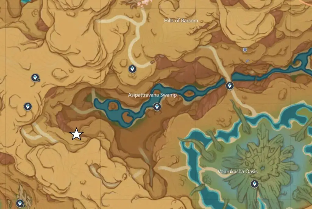 All six Udumbara Pistol nodes in Genshin Impact can be located near the Asipattravana Swamp, northwest of the Vourukasha Oasis.