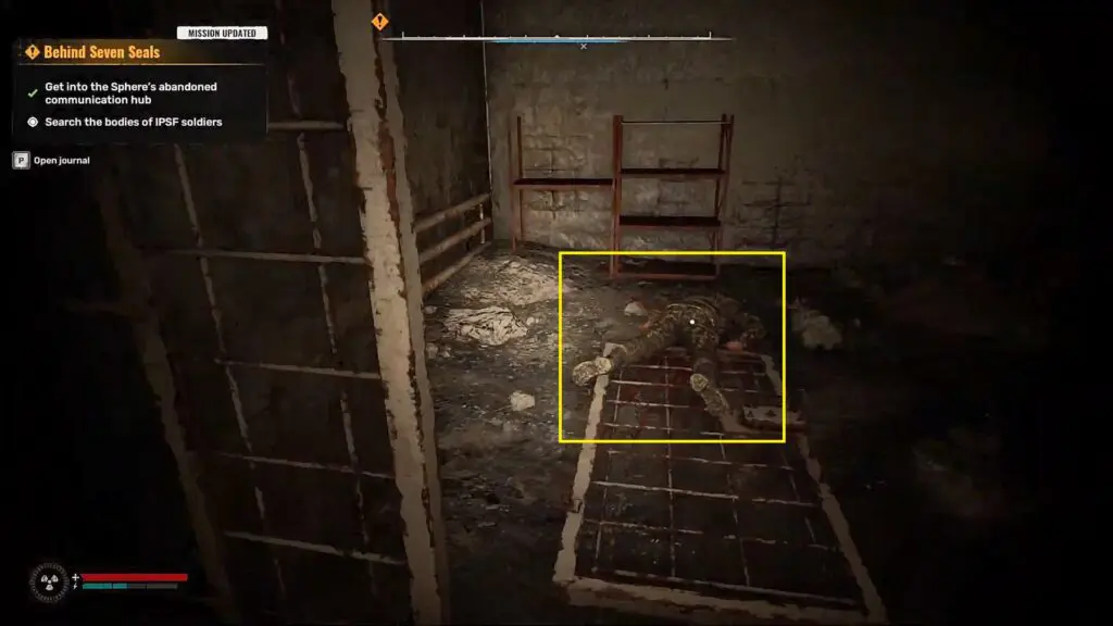 Enter the RIBS and proceed ahead until you reach the big hall at the end. Search the body of the IPSF soldier in one of the rooms connected to the hall as shown in the picture below. You will get a note from the soldier’s corpse that will tell you the Sphere Door Code (2765).
