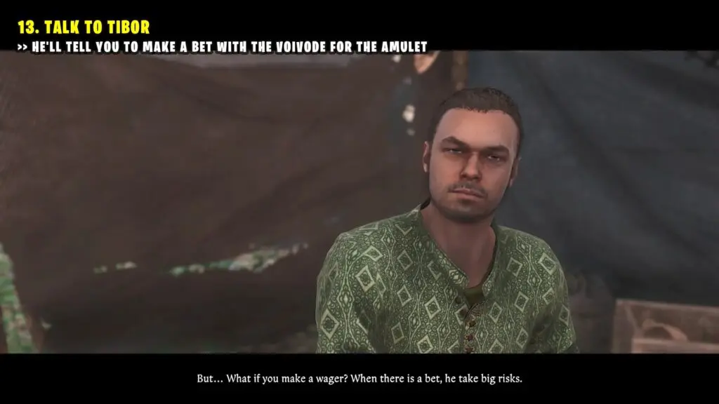 Retrieve Voivode’s Letter of Safe Conduct from the tree and head back to the Nomads’ Camp. Speak with Tibor first, and he will suggest making a wager with Voivode.
