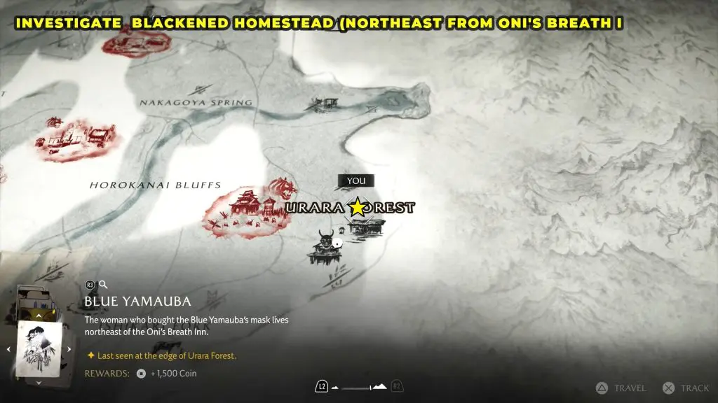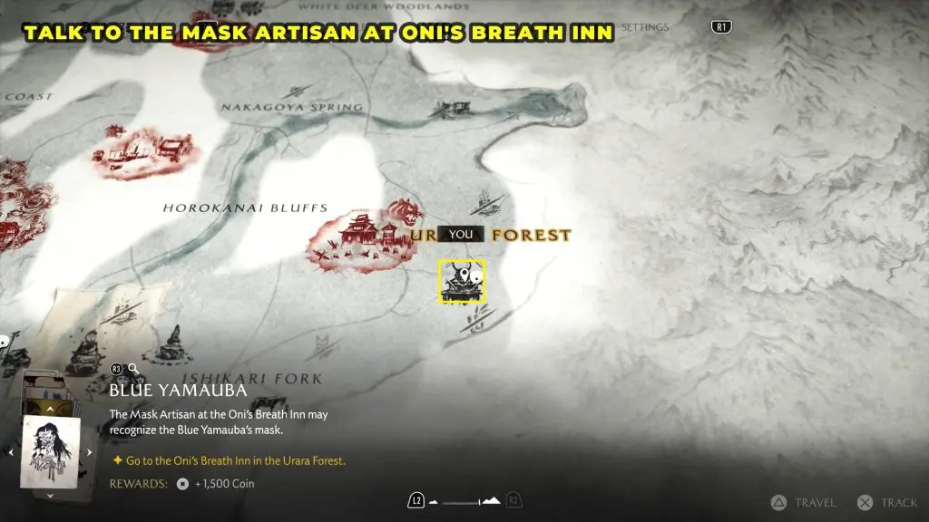 Ride to Oni’s Breath Inn. Outside the main entrance, you’ll find the mask merchant. Talk to him, and your character will automatically hand over the Blue Yamauba Drawing.
