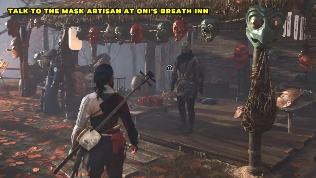 Once rescued, the settler will thank you and tell you about a mask salesman who might know more. He’ll direct you to the Oni’s Breath Inn.