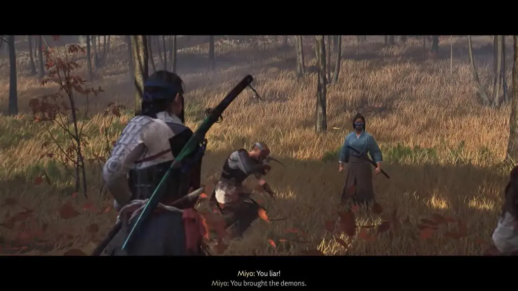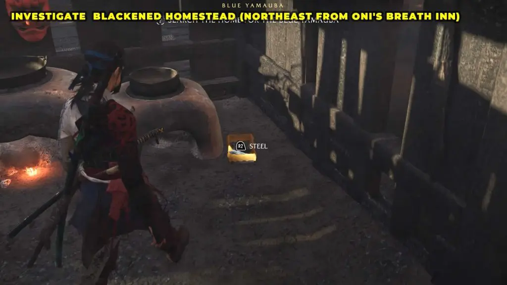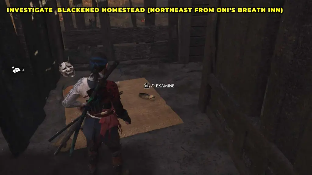 Once you arrive, you’ll encounter more Oni Raiders. Defeat them all to secure the area, then inspect the ruined house nearby.Interact with the stones, the mask, the steel utensil near the fire pit, and the wooden doll