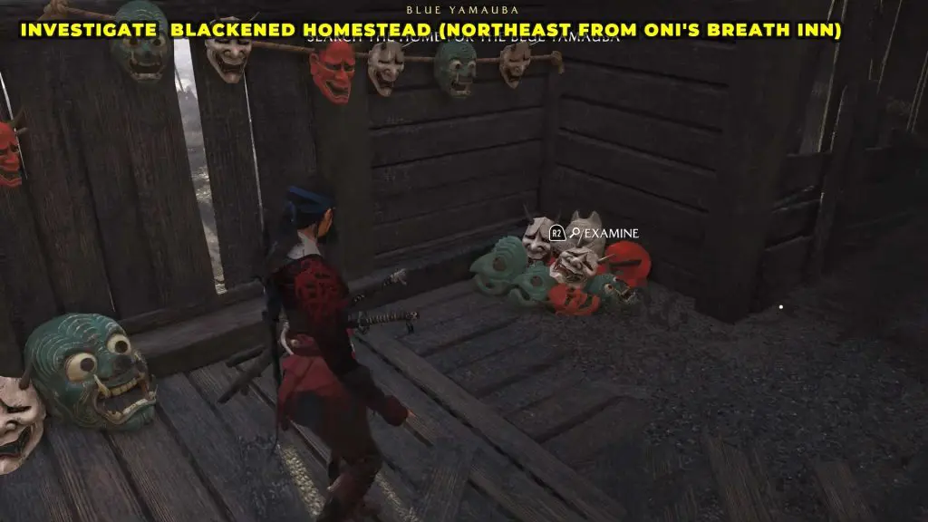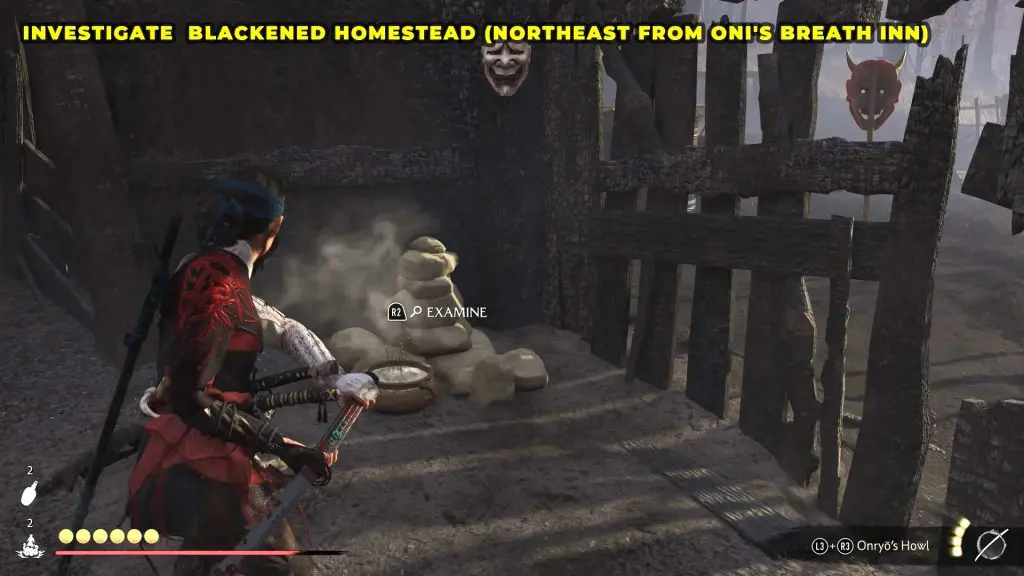 Once you arrive, you’ll encounter more Oni Raiders. Defeat them all to secure the area, then inspect the ruined house nearby.Interact with the stones, the mask, the steel utensil near the fire pit, and the wooden doll