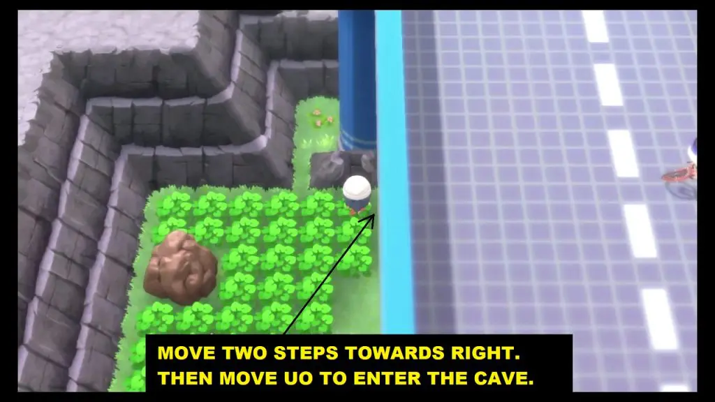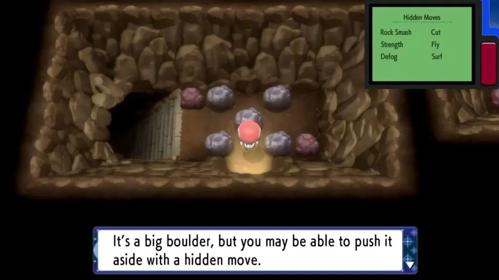 The cave will be completely dark. Use ‘Flash’ to light up the cave. then use ‘Strength’ to move the boulder blocking your path.
