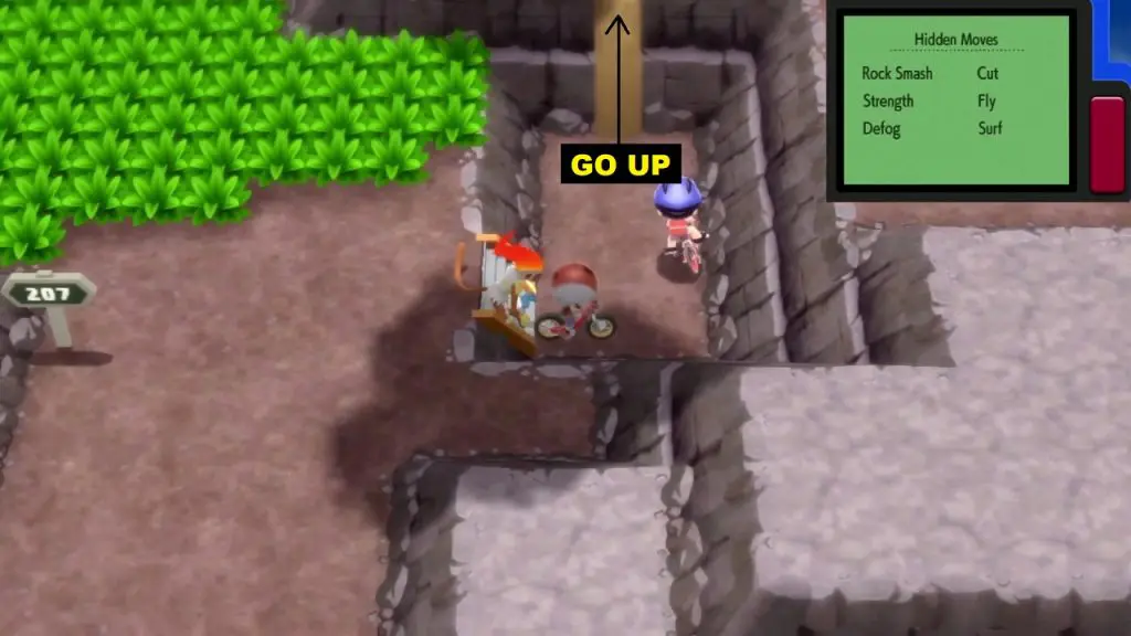 Enter the highlighted tower in Route 209 south of Solaceon Town. Go to the top of the tower and talk to the old lady there to get ‘Strength’ Hidden Move. You won’t be able to use ‘Strength’ until you have the 6th Gym badge.