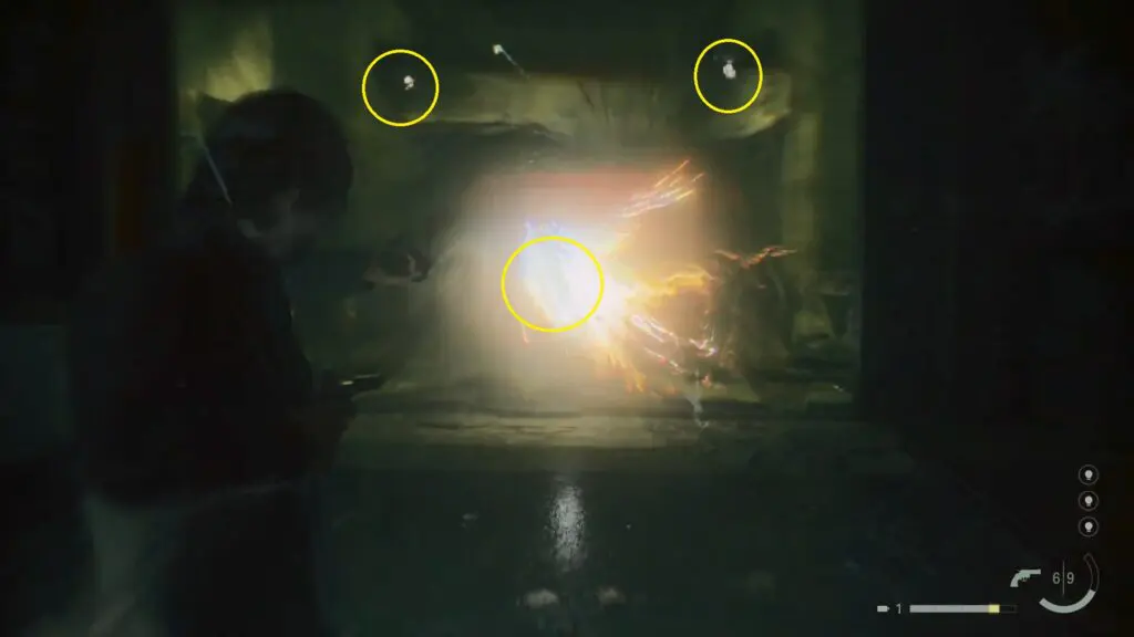 At the entrance use your flashlight to destroy the three glowing orbs, and then go inside.