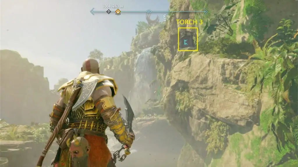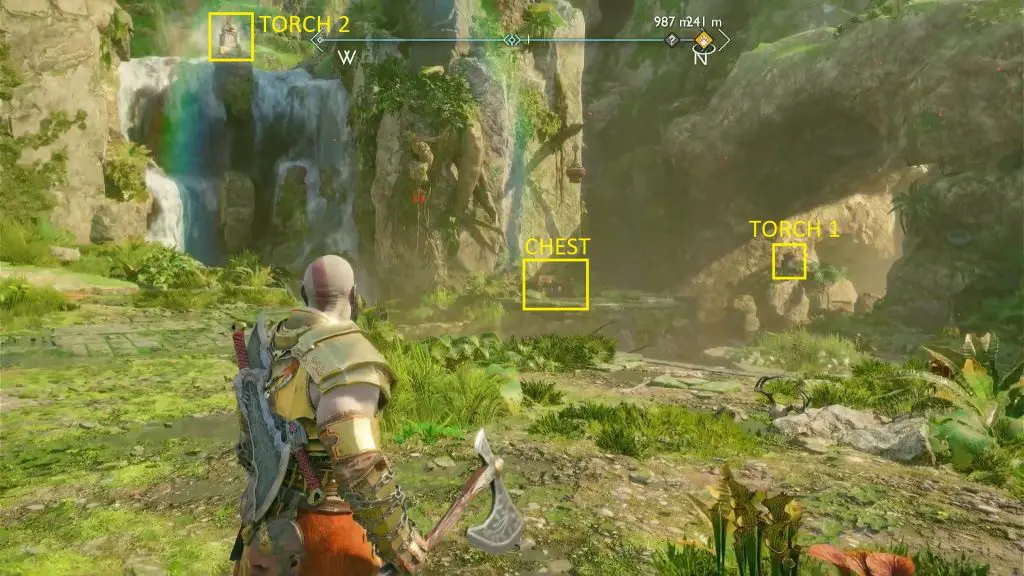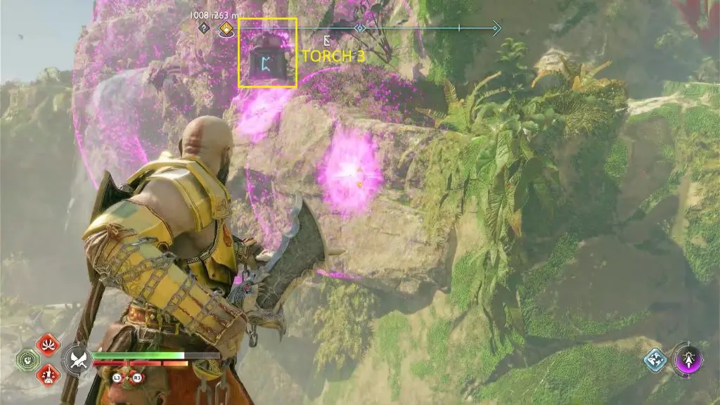 Torch #1 is on the right side of the chest and Torch #2 is on the left side of the chest as shown in the picture above. Torch #3 is on the mountain on the opposite side of the chest as shown in the picture below. To light the torches, shoot purple arrows between the torch and to a point accessible by your blade. Then use your blade to hit a purple arrow and cause an explosion, lighting up the torch. Once you have lit up all three torches, the chest will be unlocked. Open the chest to get a Horn of Mead.