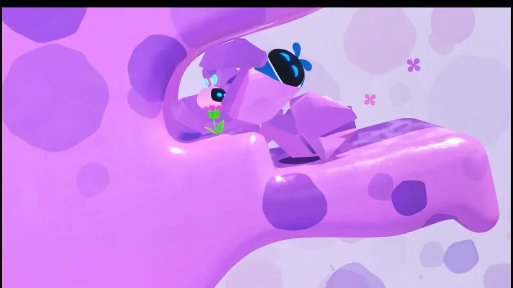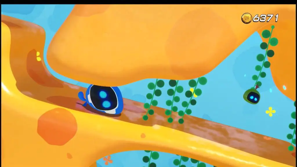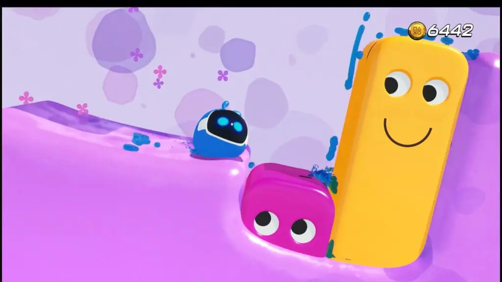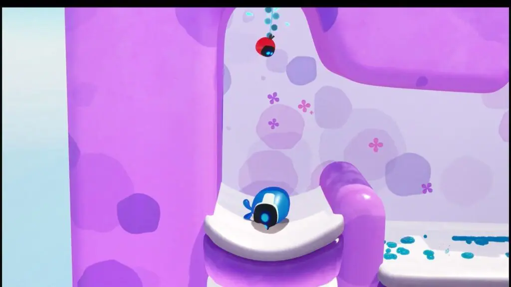 Move to the right side until you see two pink and yellow smiley-face sticks. Once they launch you in the air, break the cracked wall on the left to find the bot.