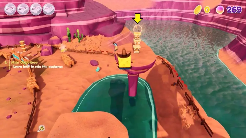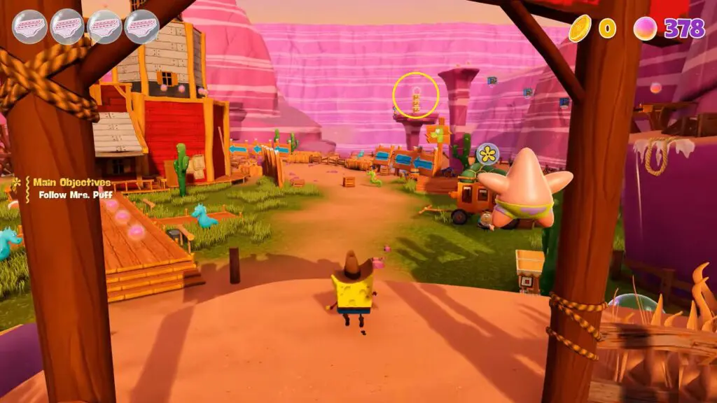 Your main task here is to “Follow Mrs. Puff” to know more about Mr. Krabs. Continue to follow to reach Mrs. Puff Riding Ranch.