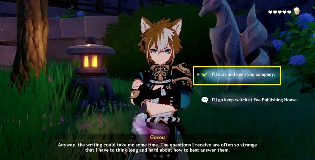 Then go to the next objective marker for the “Go to a quiet spot to finish writing the replies”. Select “I’ll stay and keep you company” when the option comes.