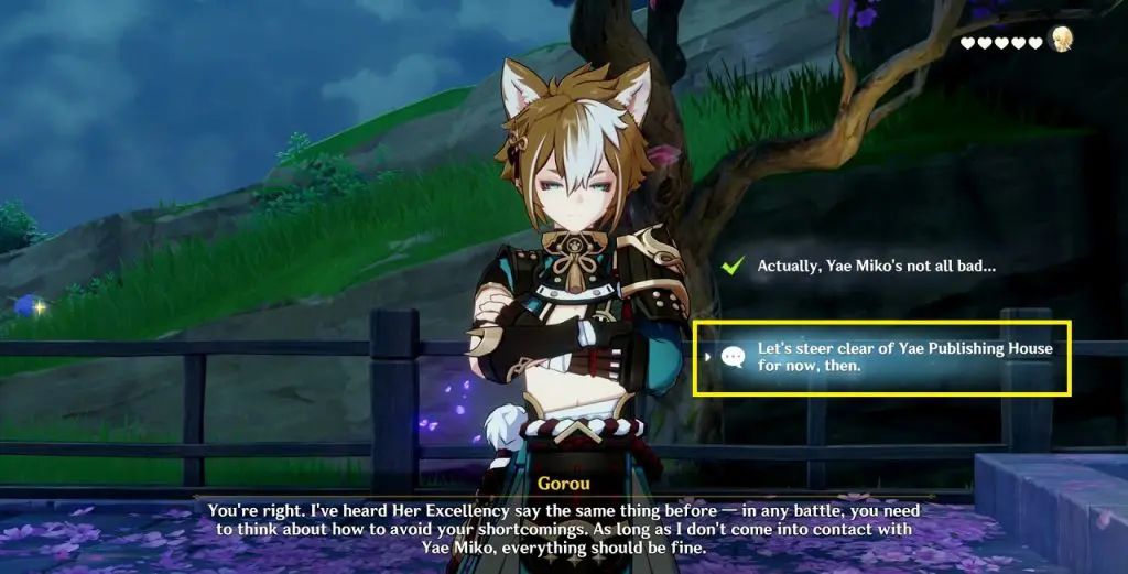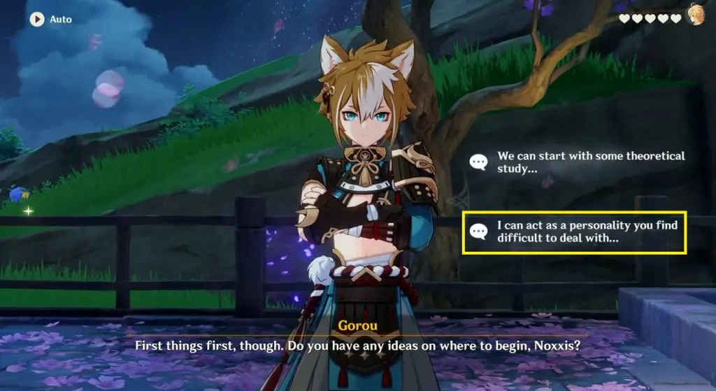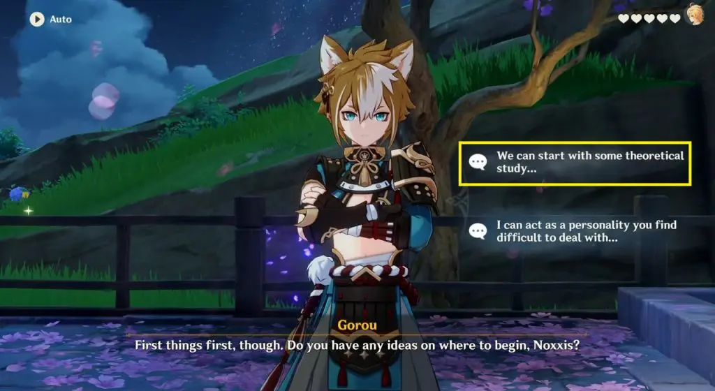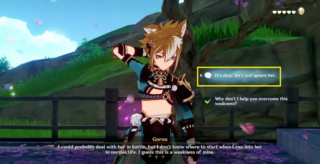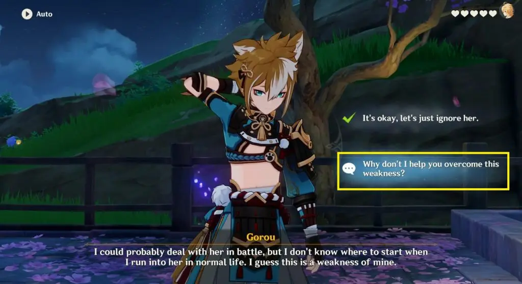Go and talk to Gorou. In the conversation, choose any dialogue option you want until you get the dialogue option as shown in the picture below. Select “Why don’t I help you overcome this weakness?