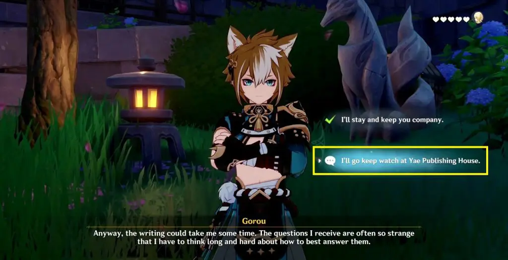 Then go to the next objective marker for the “Go to a quiet spot to finish writing the replies”. Select “I’ll go keep watch at Yae Publishing House.” when the option comes.