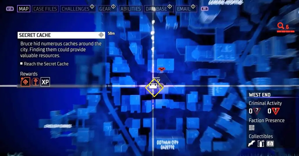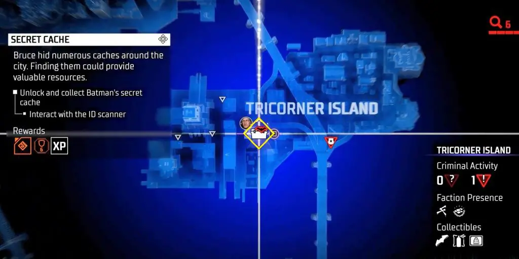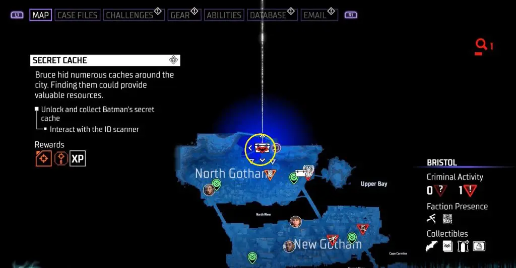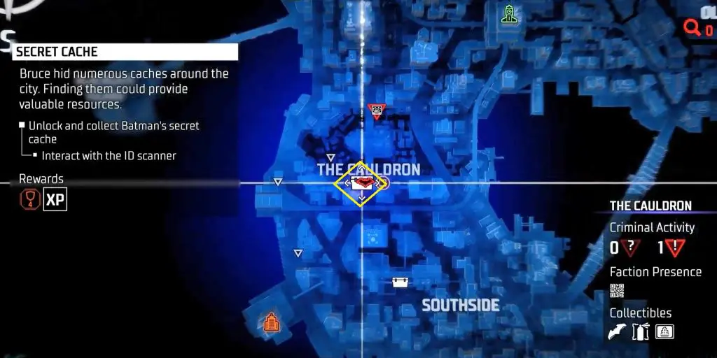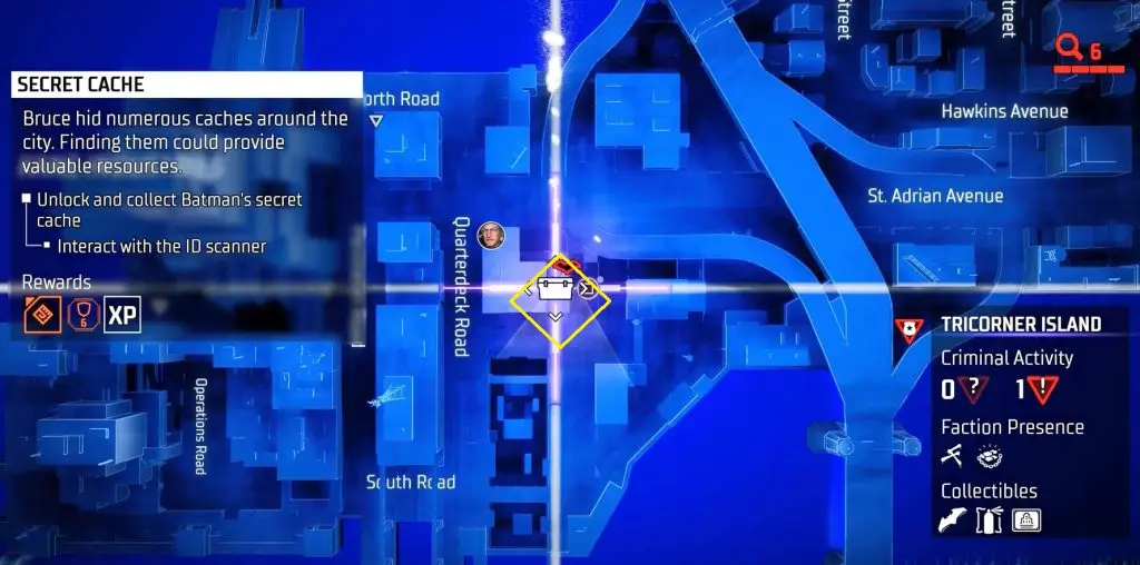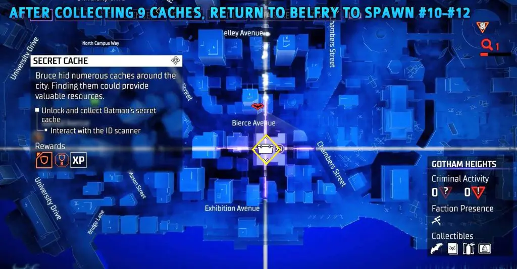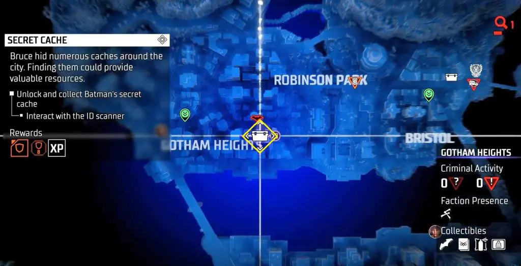 In-game, these collectibles are known as “Secret Caches,” however in the trophy list, they are known as “Bruce Wayne’s Hidden Audio Recordings.” They are marked on the map by white Box Icons and become available after completing Main Case 01: Batman’s Last Case. Return to The Belfry (Headquarters) after collecting all of the available ‘Secret Caches’ to generate more.