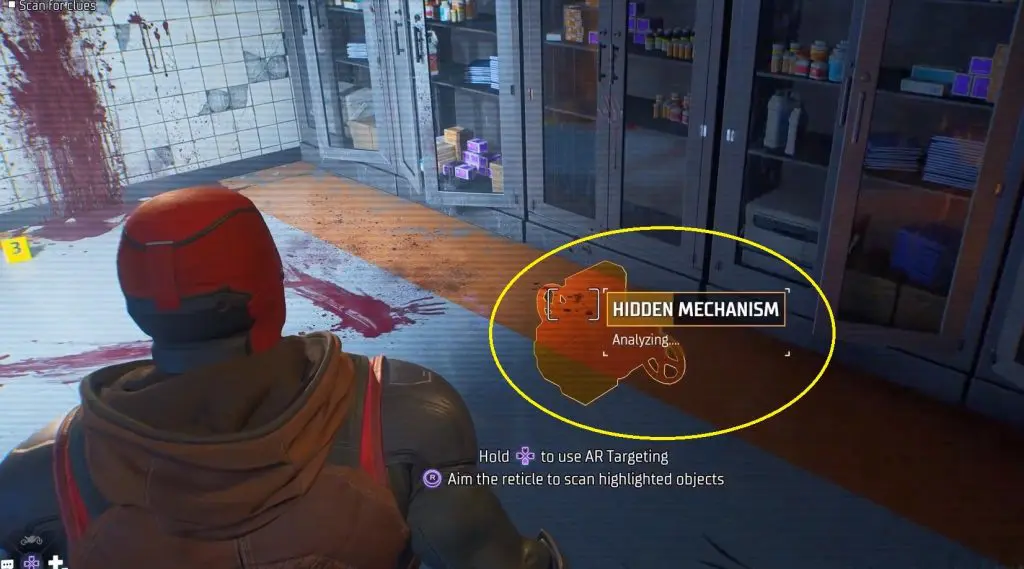 Once reach the crime scene, observe the blood stains on the right corner of the room. You have to use the Augmented Reality ability by holding D-Pad Down to find a mechanism under the door.