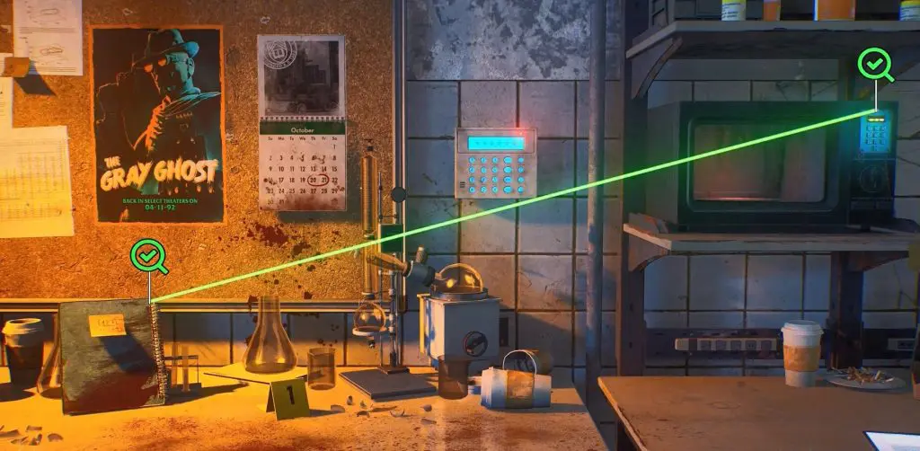 Here you have to highlight the “Sticky Note” on the left and the “Microwave” on the right by pressing Square (PlayStation) / X (Xbox). Then press Triangle (PlayStation) / Y (Xbox) to confirm the solution. This will turn the line green and displays checkmarks after each clue. The door code is 127.